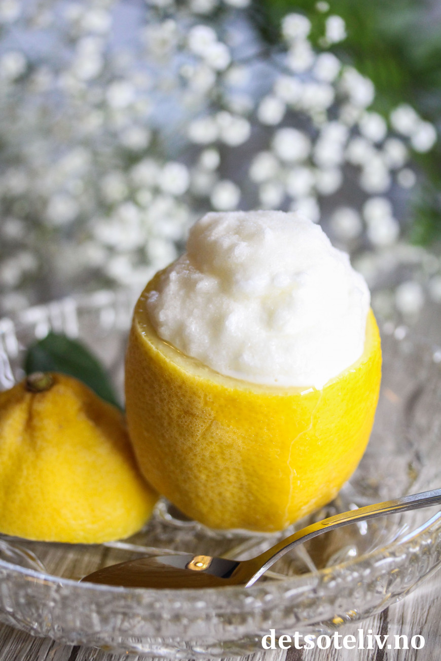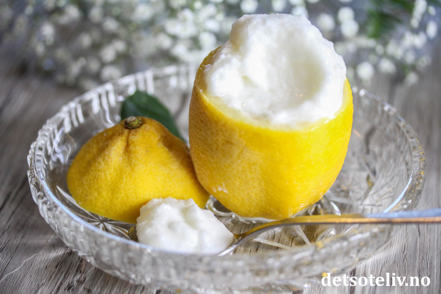 Sorbeten kan gjerne serveres i frosne, uthulede sitroner for ekstra lekker effekt!