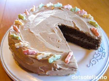 Pisk kremfløten og smak til med sjokoladesaus eller sjokolademelkpulver. Alternativt kan du piske opp en pakke ferdigkjøpt sjokoladekrem. Fordel sjokoladekremen inni og utenpå kaken. Pynt kaken med godteri.
