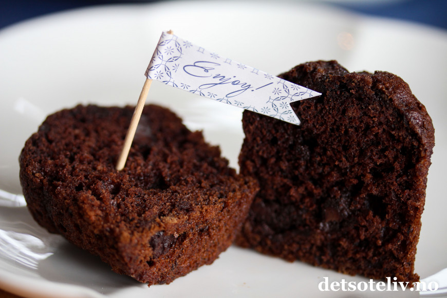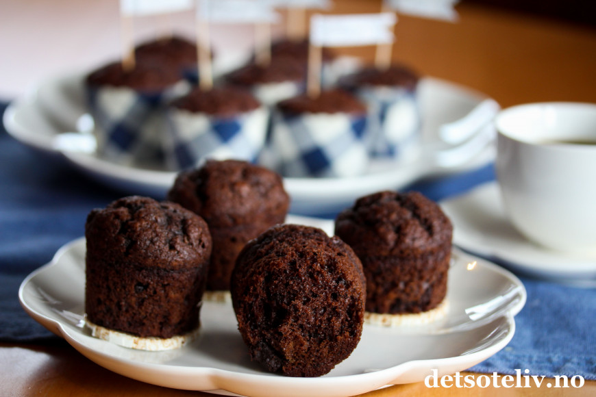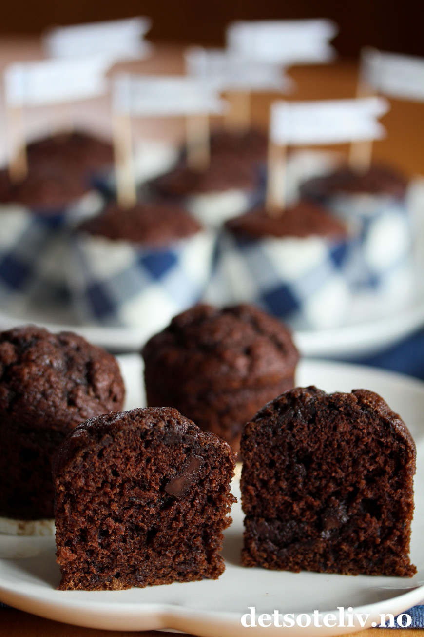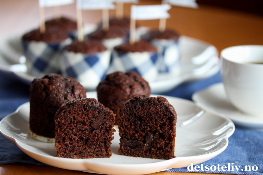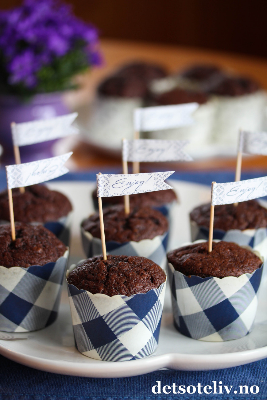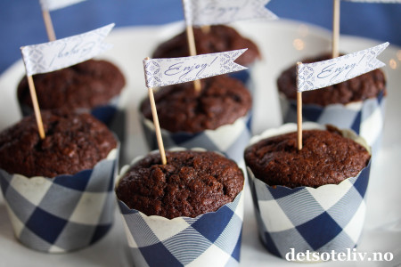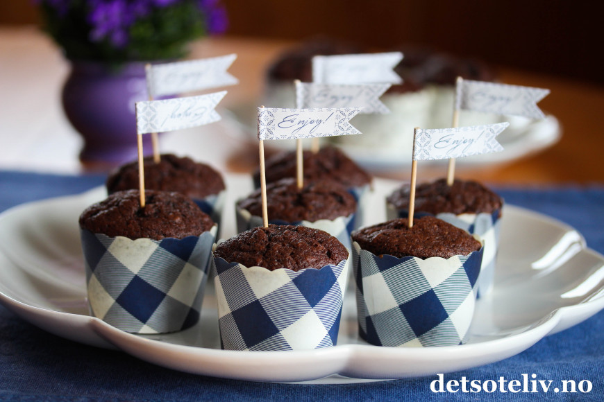 ♥ Hvis du vil, kan du glasere muffinsene med sjokoladeglasur (dette lager du lett ved å smelte 100 g kokesjokolade i 0,5 dl kokende varm kremfløte) eller lage en sjokoladekrem (se flere ulike oppskrifter her på Det søte liv).