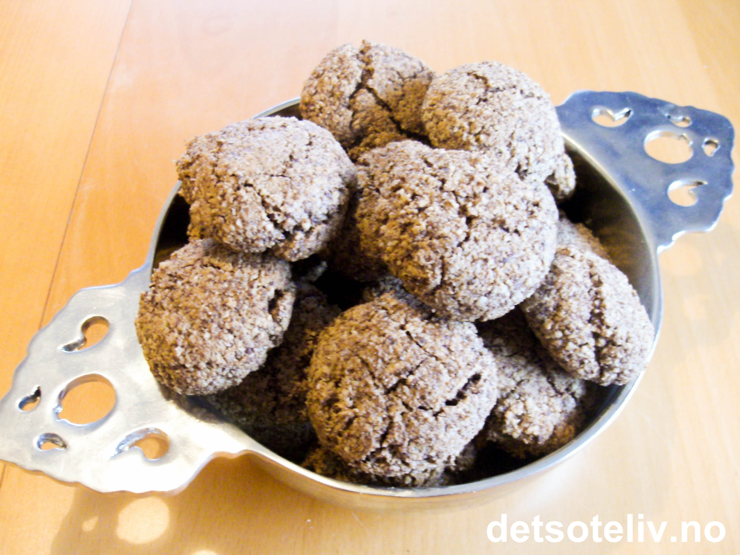 Form deigen til runde kuler, eller sett deigen i topper med to teskjeer på bakepapirdekkede stekeplater. Stek kakene midt i ovnen ved 180°C i ca 15 min. Avkjøl kakene en stund på platen før de forsiktig flyttes over på rist ved hjelp av en stekespade og avkjøles helt.