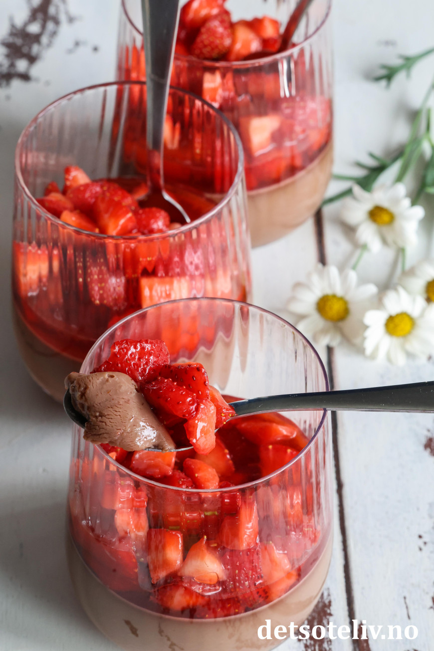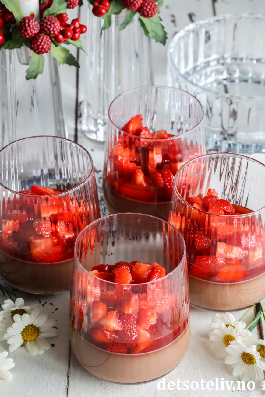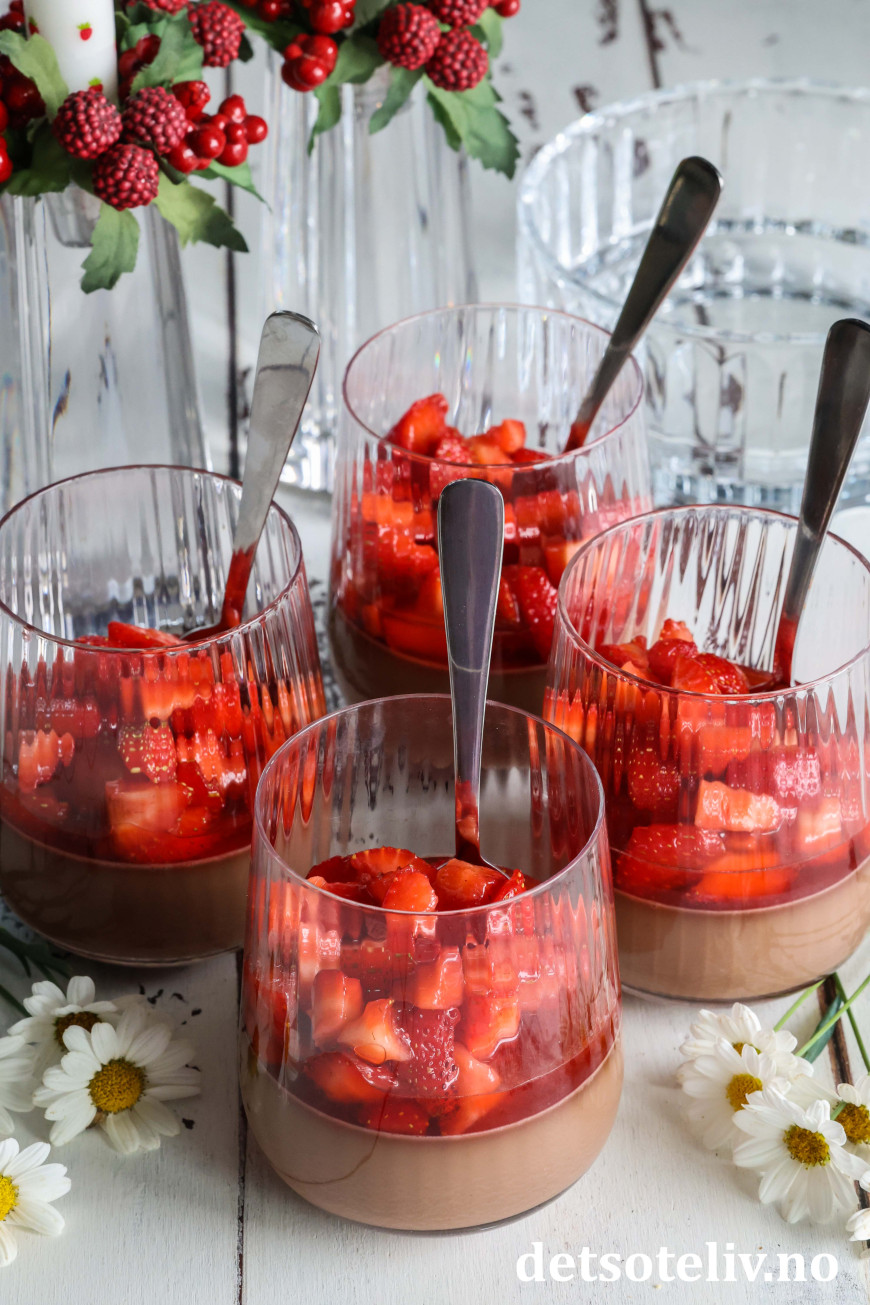 ♥ Sjokolade-panna cottaen lages gjerne dagen i forveien, men topp med sukrede jordbær på serveringsdagen.