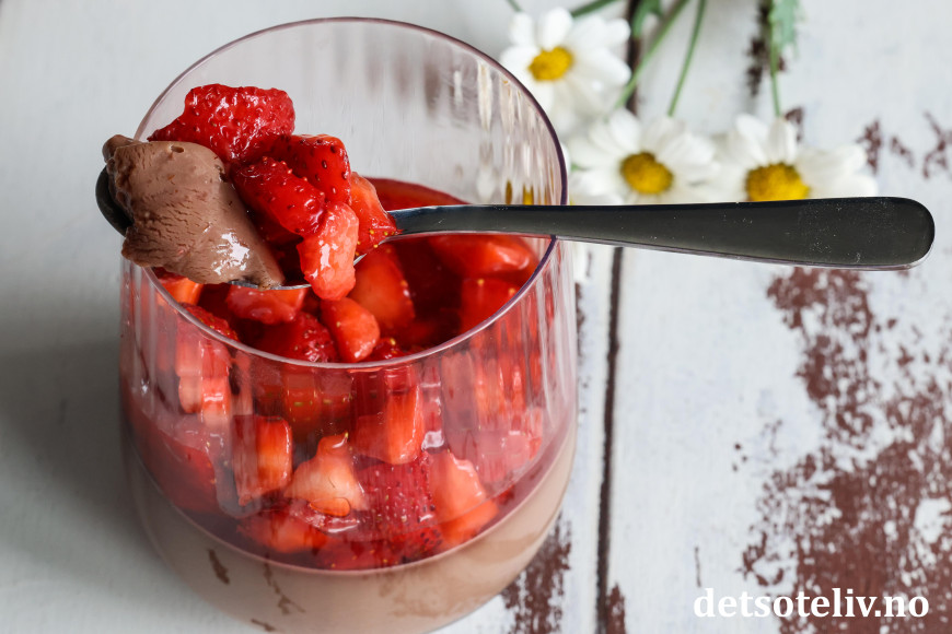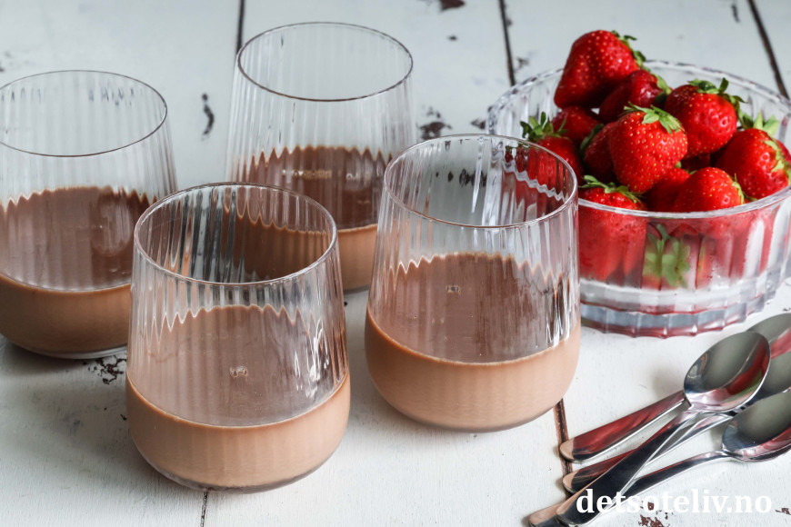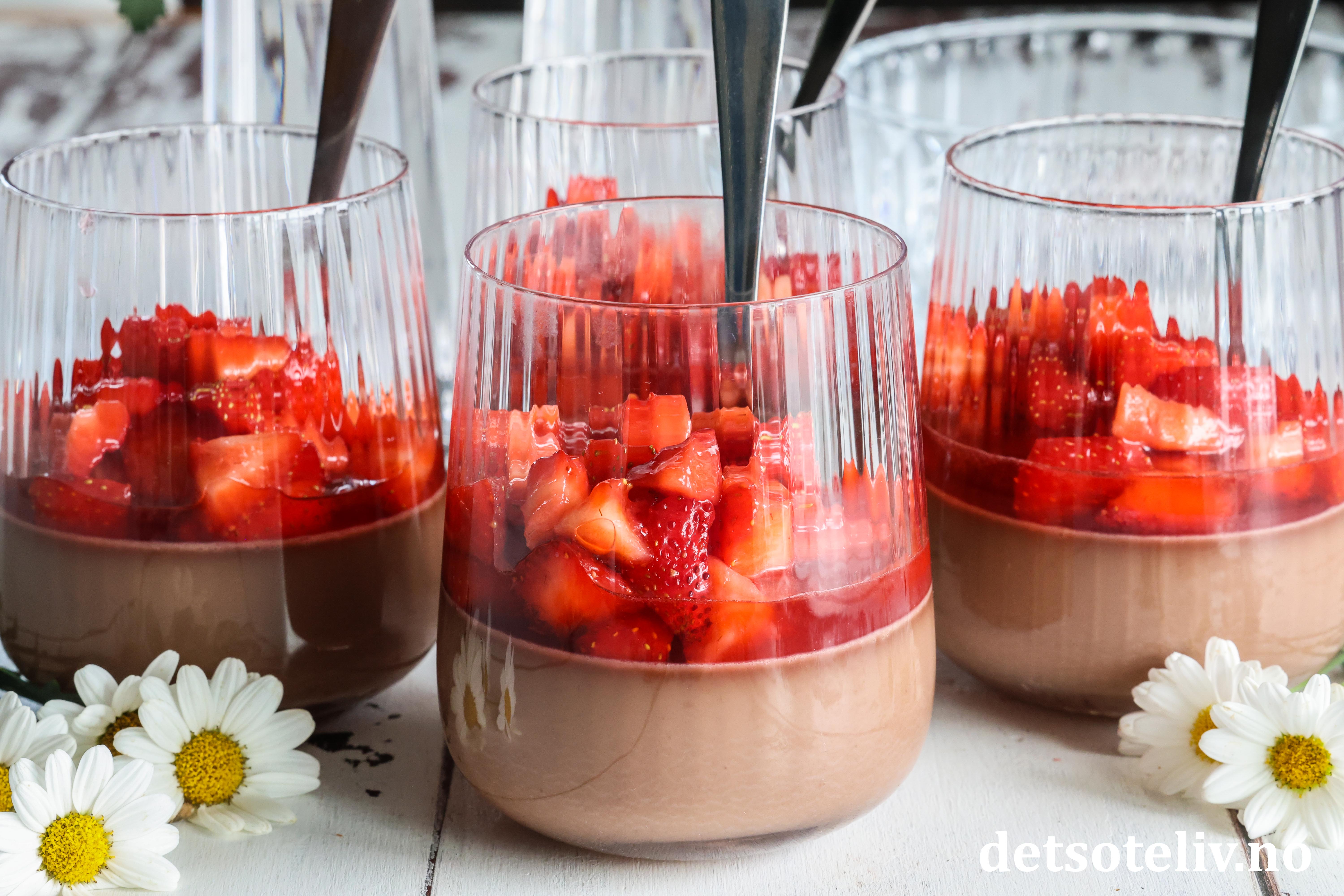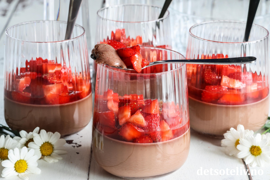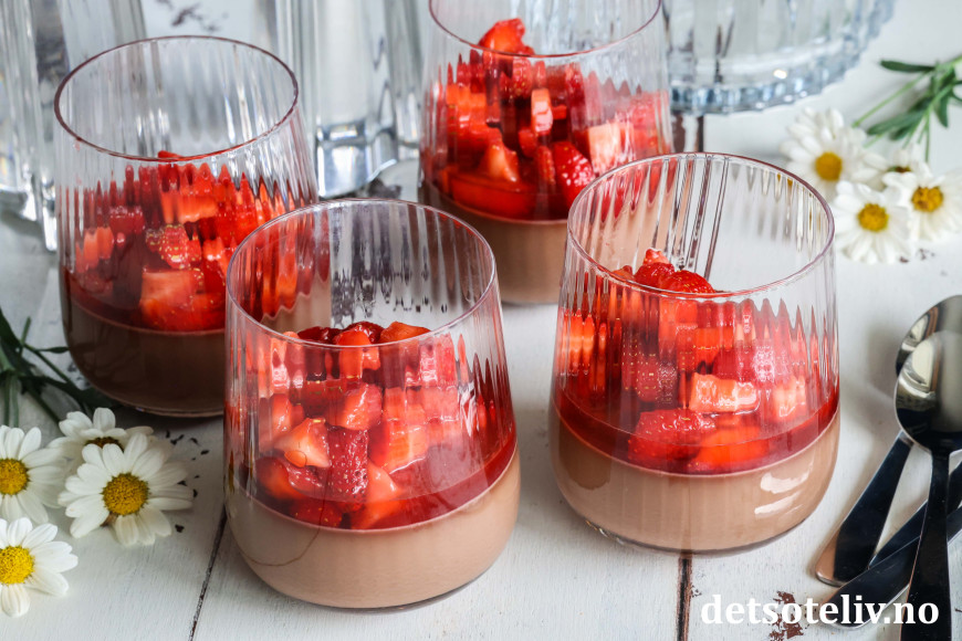 ♥ Sjokolade-panna cottaen lages gjerne dagen i forveien, men topp med sukrede jordbær på serveringsdagen.