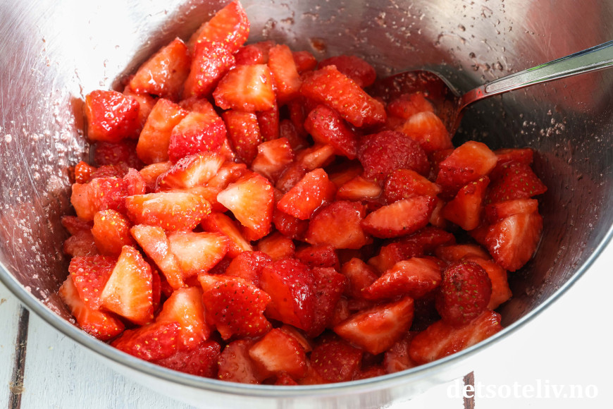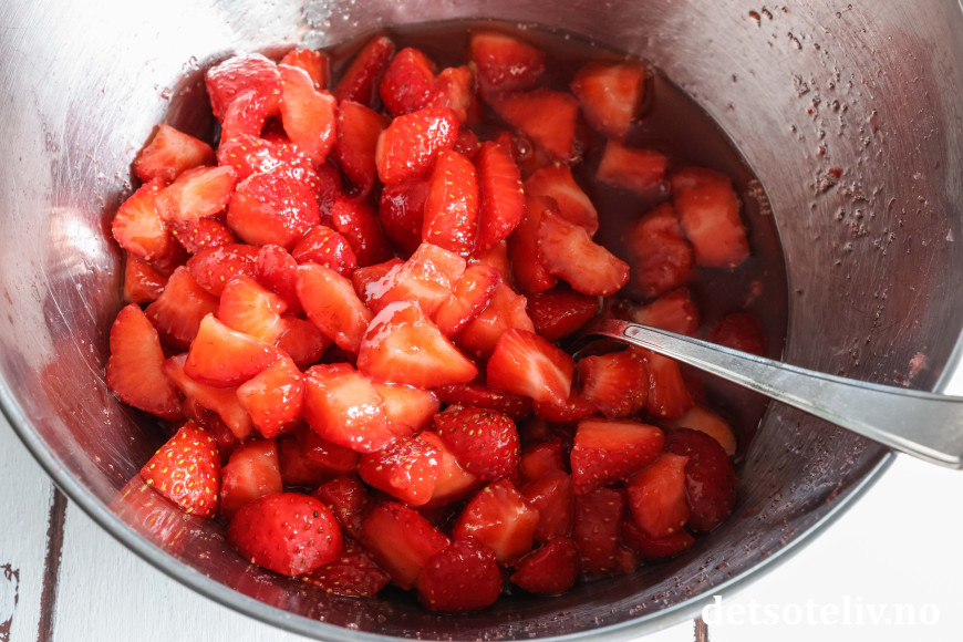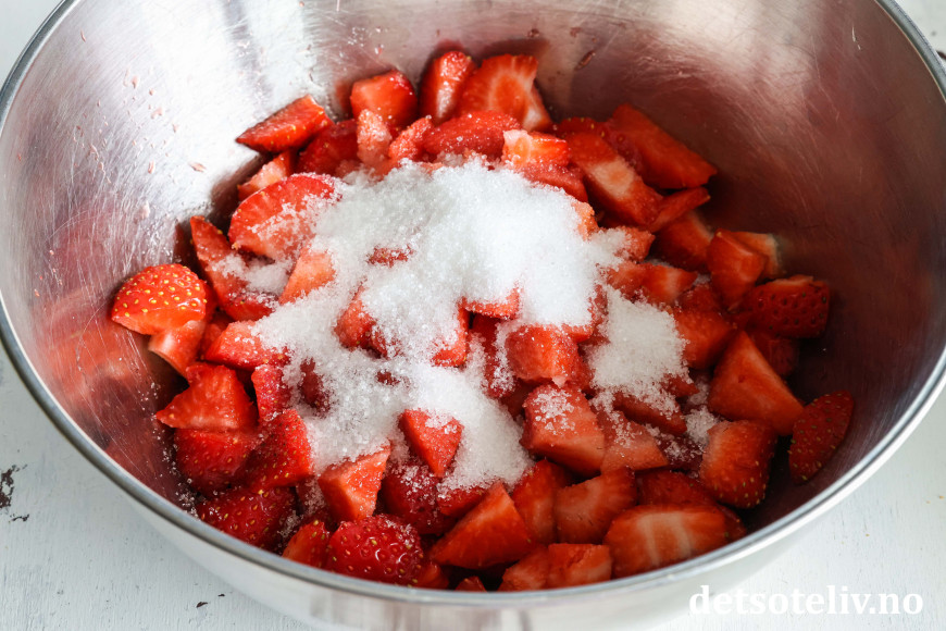 Rens og del jordbærene i biter. Lett dem i en skål og ha over sukkeret. Bland sukkeret godt med jordbærene.