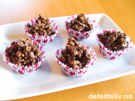 Smelt sjokoladen i en metallbolle over vannbad. Rør i Rice Krispies (se tips).