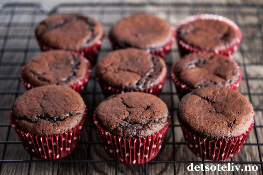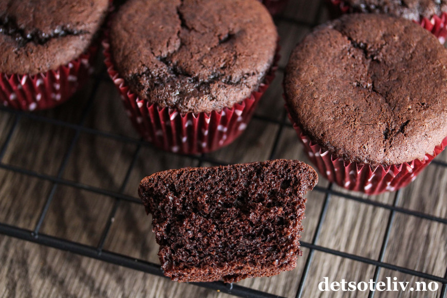 ♥ Merk at disse sjokolademuffinsene blir veldig luftige og nærmest litt porøse. Det er slik de skal være.