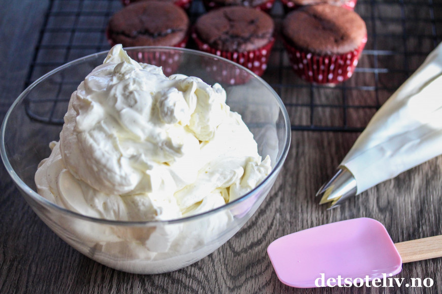 ♥ Denne porsjonen mascarponekrem gir nok mengde til en liten rosett på hver muffins. Ønsker du større topp, må du doble oppskriften på kremen.