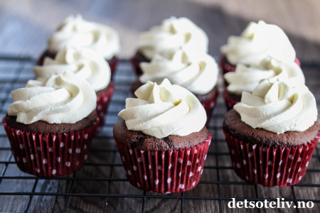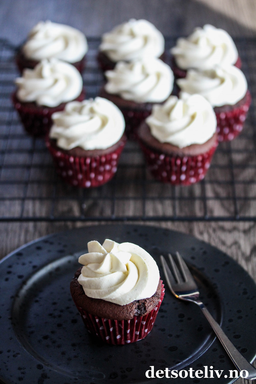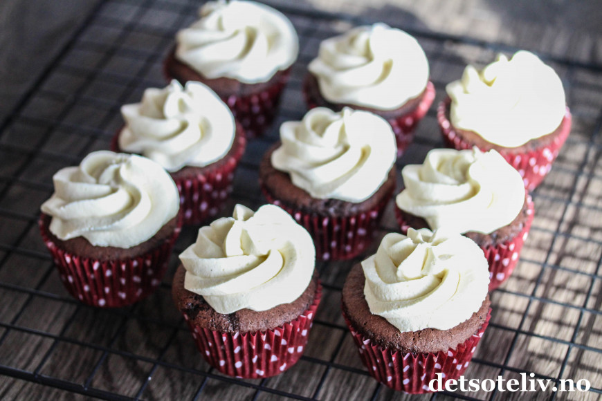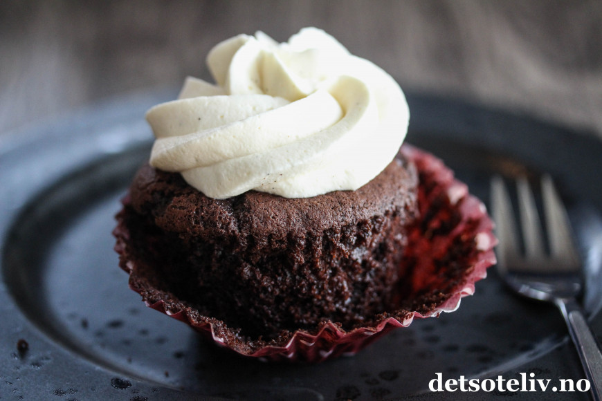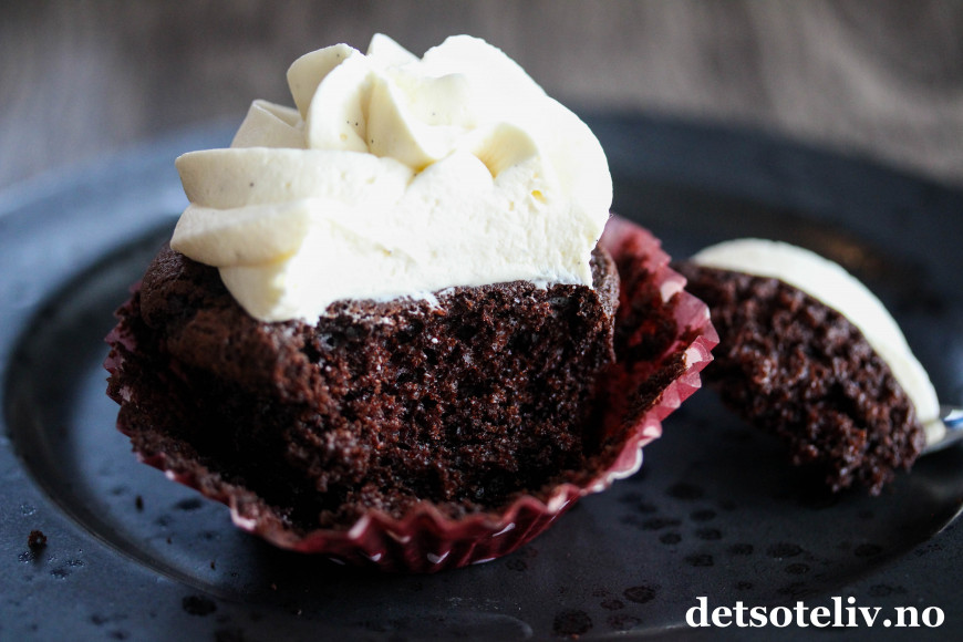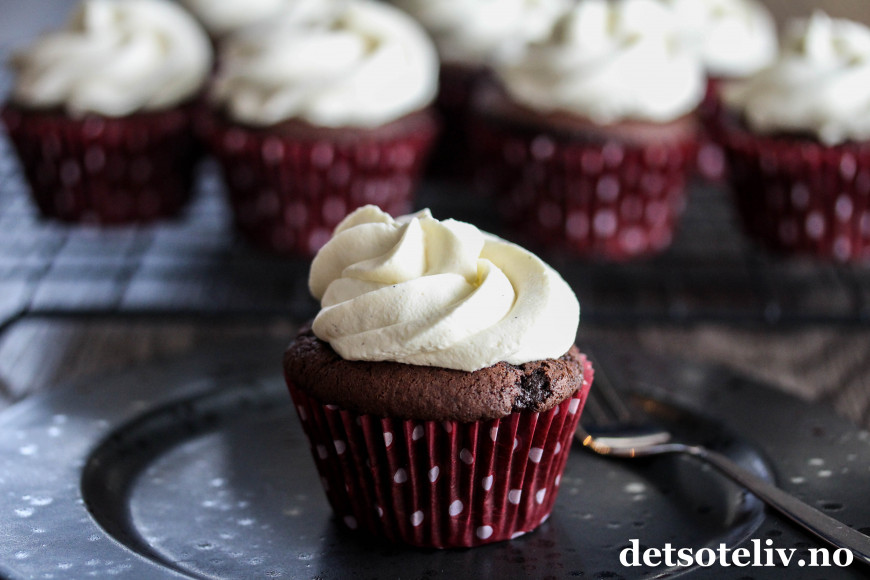 ♥ Se også oppskrift på fantastisk gode Sjokoladecupcakes med sjokolade-mascarponekrem.