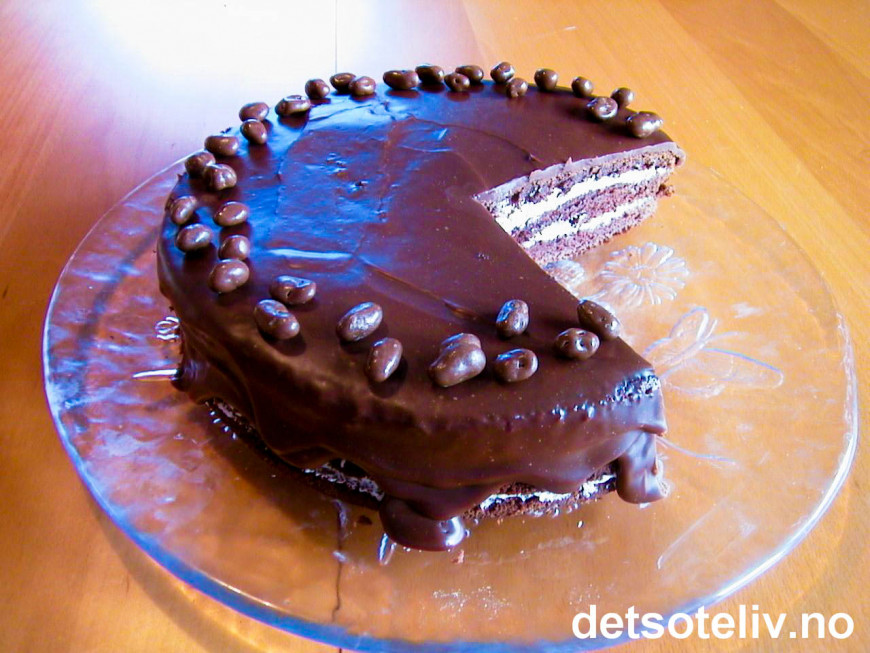 Hell glasuren over kaken og la den renne litt nedover sidene på kaken. Bruk en smørekniv og stryk glasuren glatt på toppen av kaken. Pynt kaken med sjokoladerosiner eller etter ønske. Sett kaken i kjøleskapet til glasuren har stivnet.