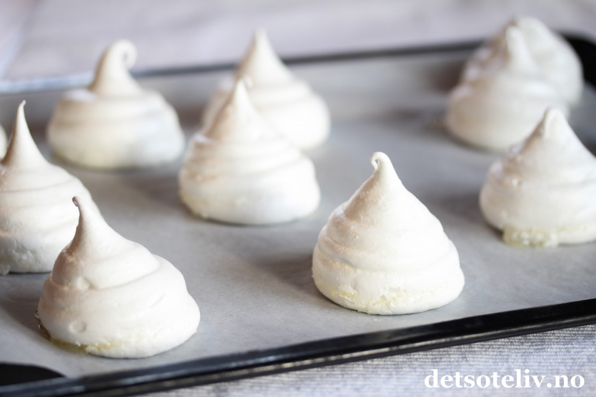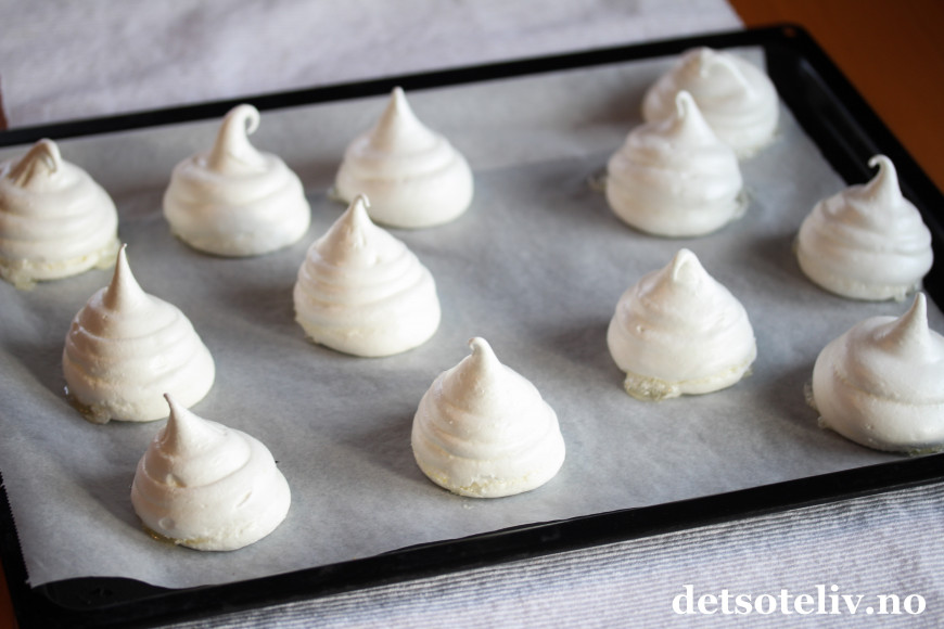 Ha den stive marengsen i en liten plastpose. Klipp hull i den ene enden og sprøyt ut runde topper på bakepapirdekket stekeplate. Det gjør ikke noe om toppene er litt ujevne i fasongen, men lag dem gjerne med en spiss på toppen.
