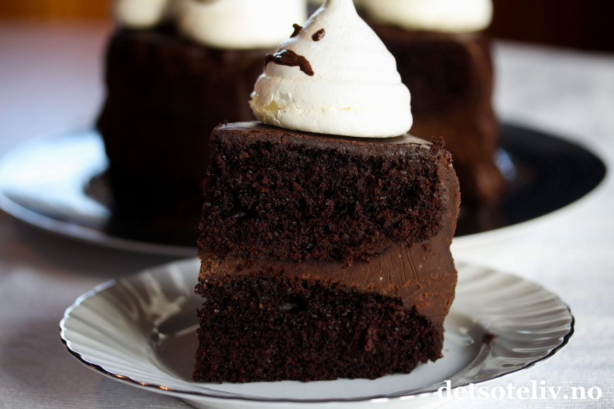 Selve sjokoladekaken er en amerikansk "Chocolate Fudge Cake" og er virkelig fantastisk! Utrolig saftig, og 6 plater kokesjokolade i tillegg til 1,5 dl kakaopulver gir en enormt deilig sjokoladesmak.