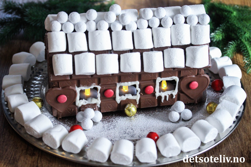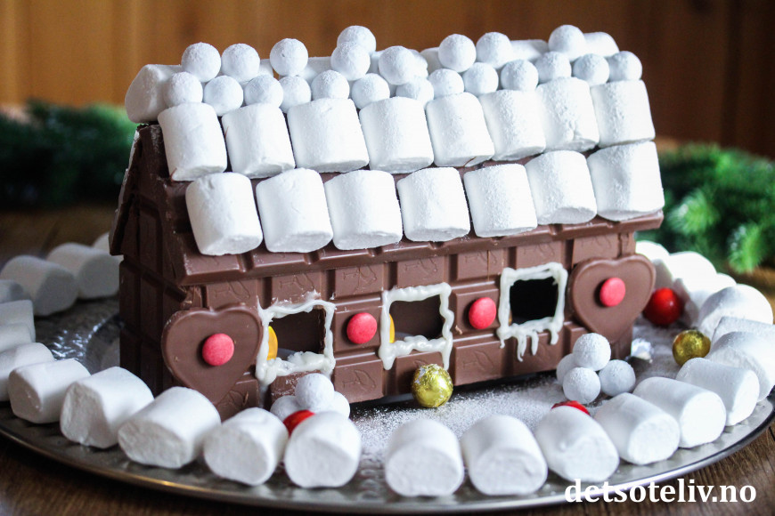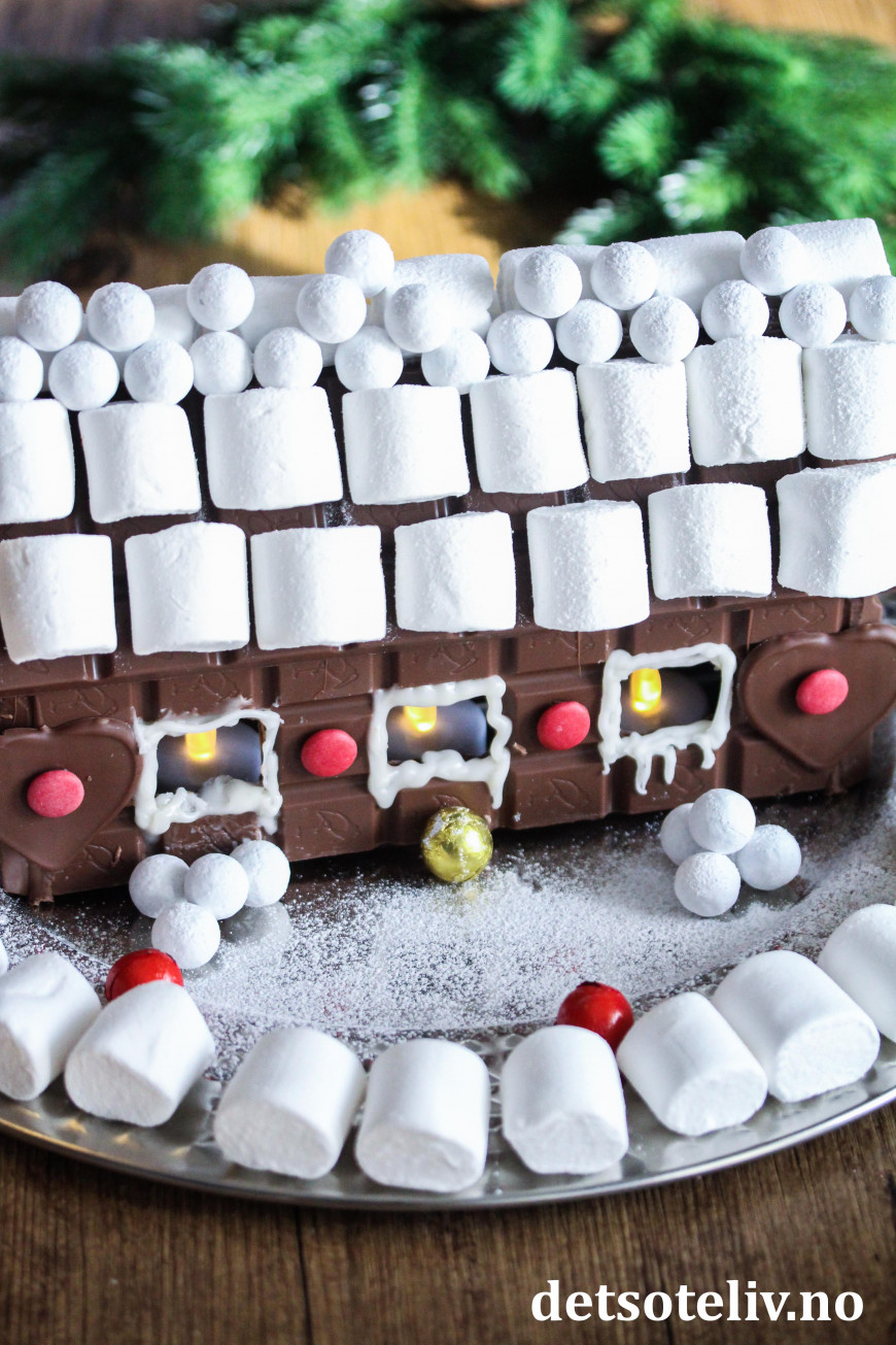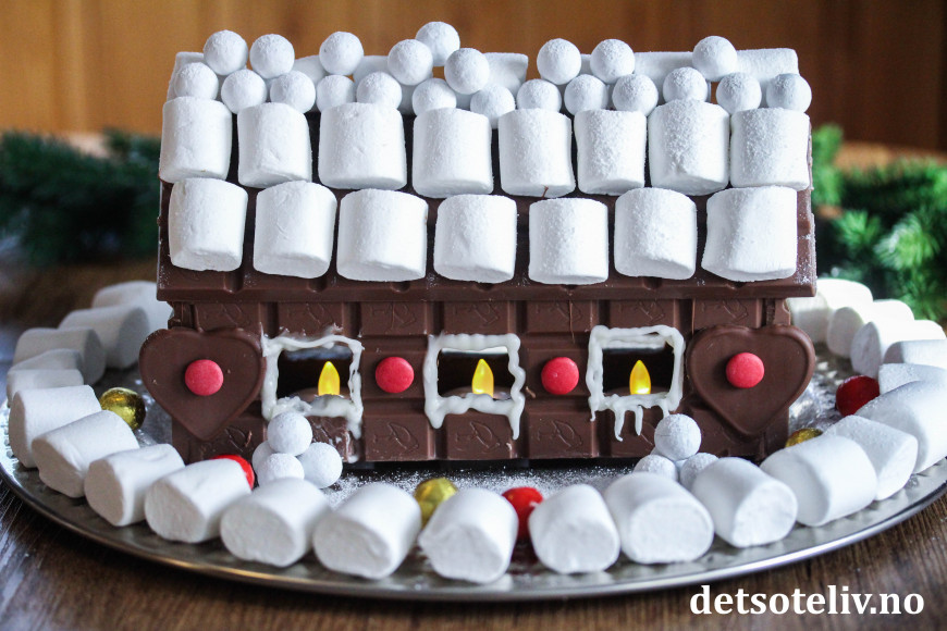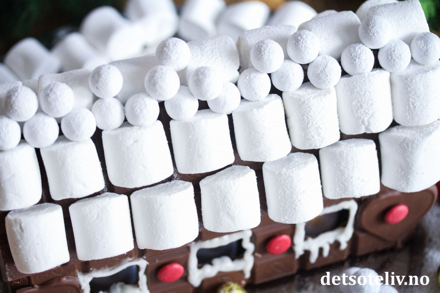 I år lagde jeg to forskjellige sjokoladehus! Her er det ene som jeg pyntet med masse hvite marshmallows, som får huset til å se ut som det er dynget ned av snø.