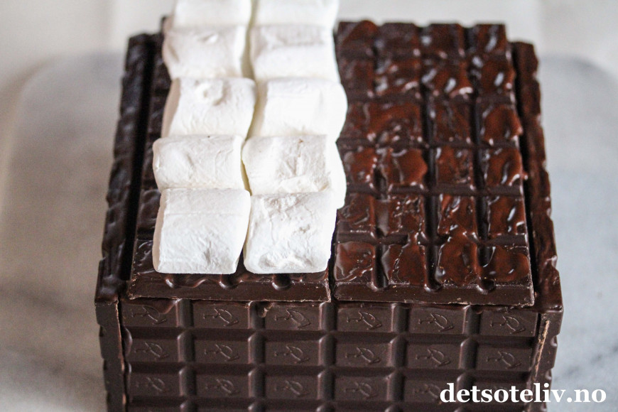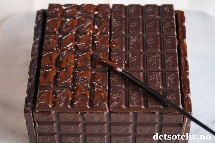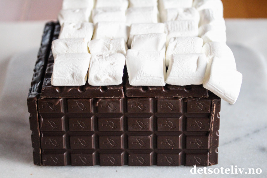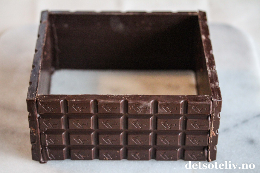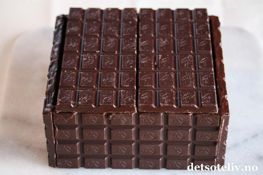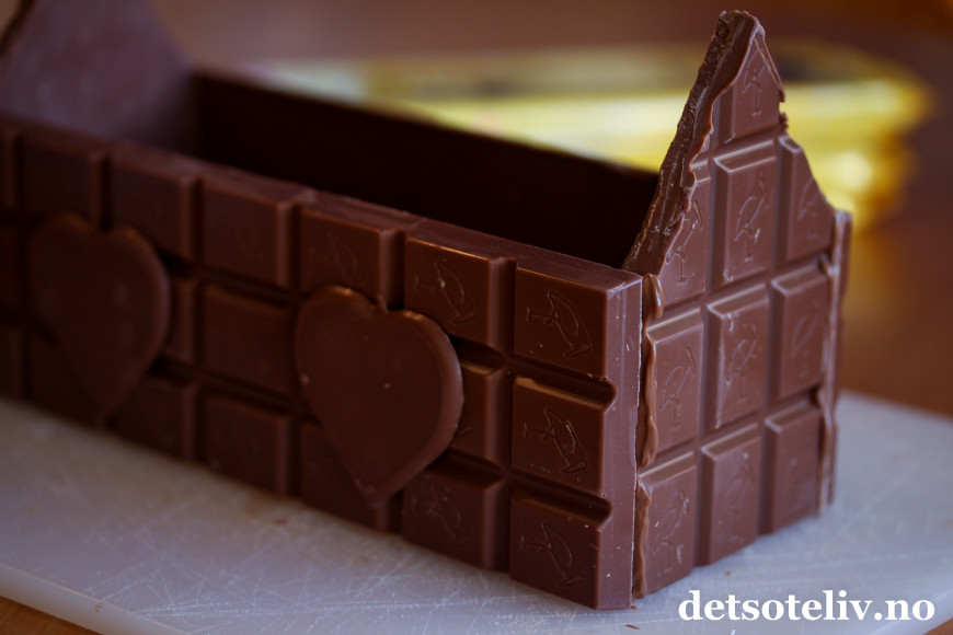 Først satte jeg fire sjokoladeplater sammen som vegger.