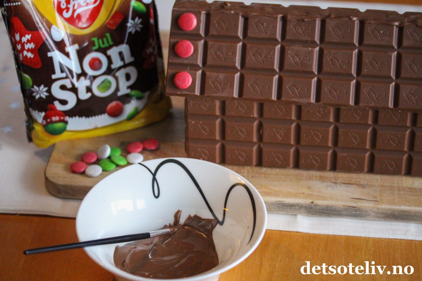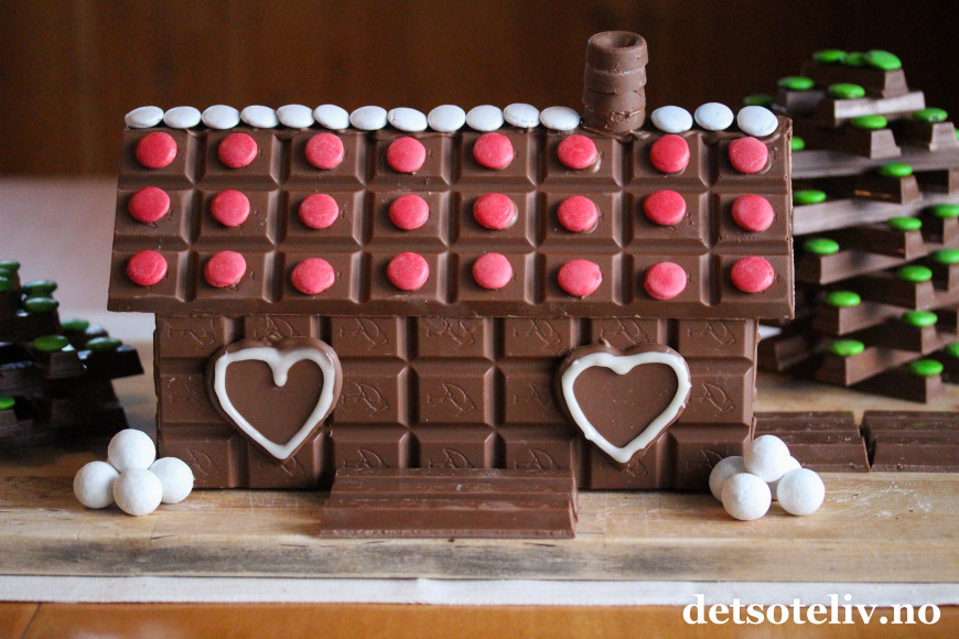Hvis du vil, kan du skjære ut vinduer i sjokoladeplatene, men en enklere måte å lage vinduer på synes jeg, er å bare lime på noen Freia Melkehjerter med smeltet melkesjokolade.