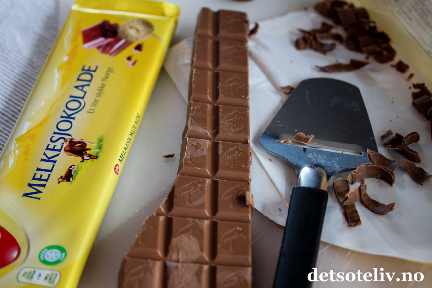 ♥ Det er lett å lage høvlet sjokolade. La melkesjokoladeplaten må stå i romtemperatur over natten så den er passe myk i konsistensen. Sett sjokoladeplaten på høykant og bruk ostehøvelen til å høvle ruller.
