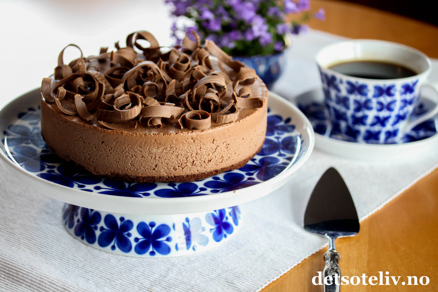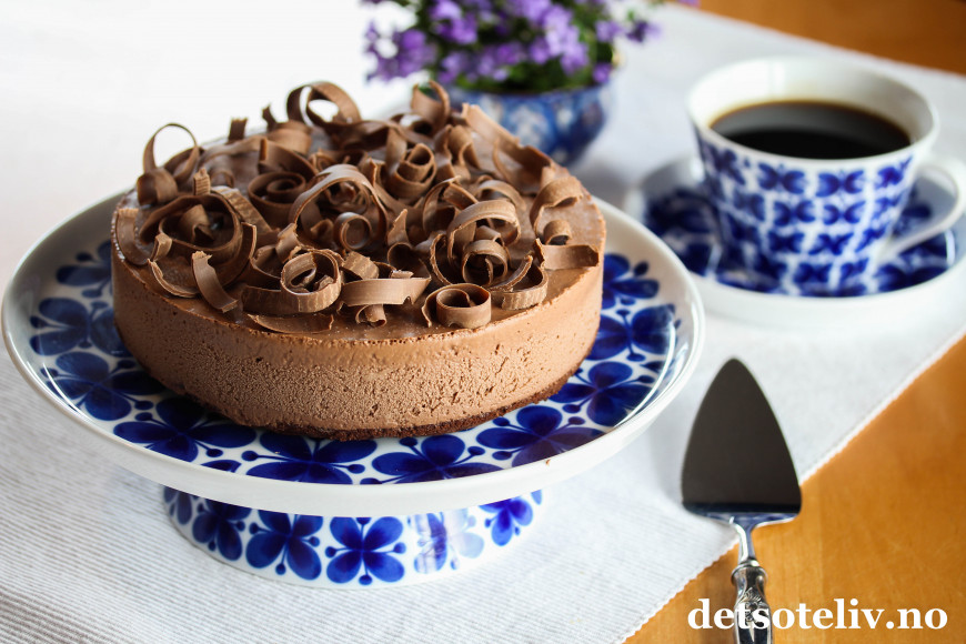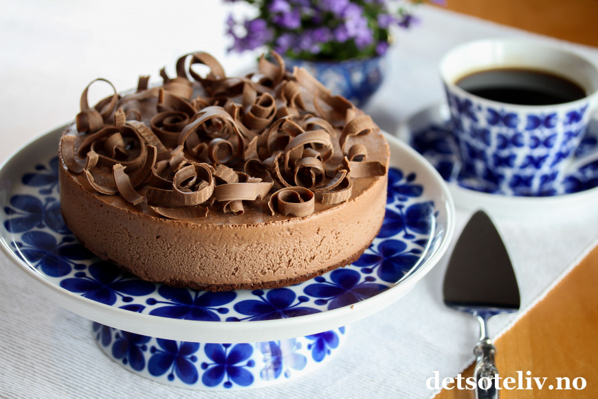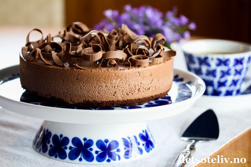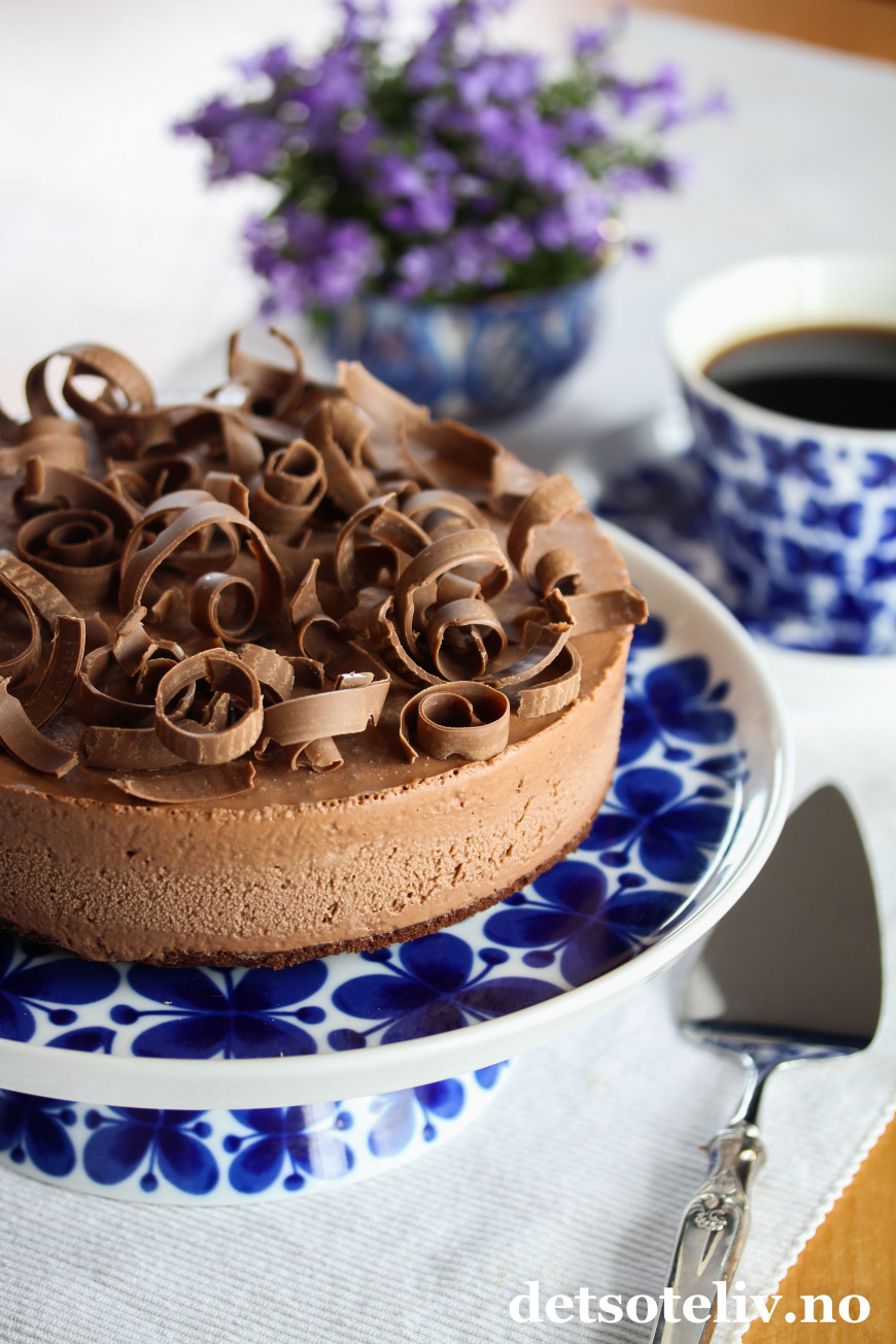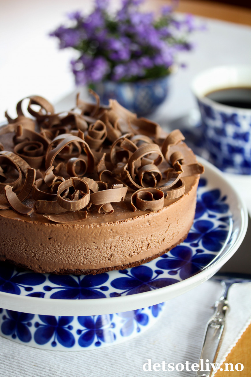 Pynt kaken gjerne med høvlet melkesjokolade, som du lager enkelt ved å høvle på en romtemperert melkesjokoladeplate med en ostehøvel.