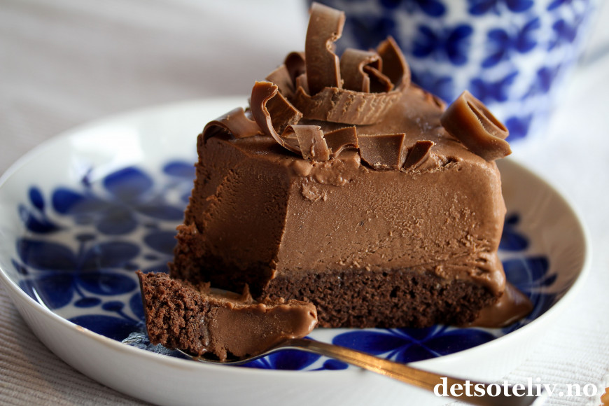Ta kaken ut av fryseren ca. 15 minutter før servering og sett kaken på et fat. Pynt kaken gjerne med høvlet melkesjokolade, som du lager enkelt ved å høvle på en romtemperert melkesjokoladeplate med en ostehøvel.