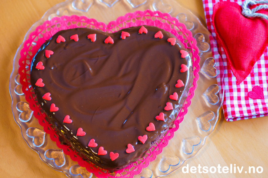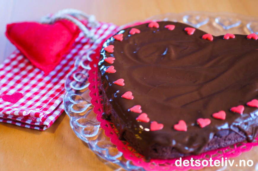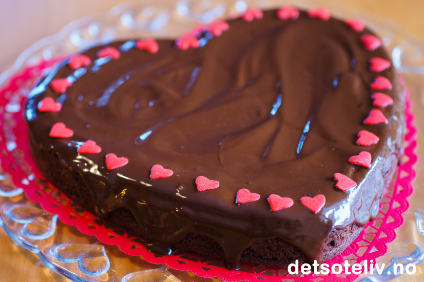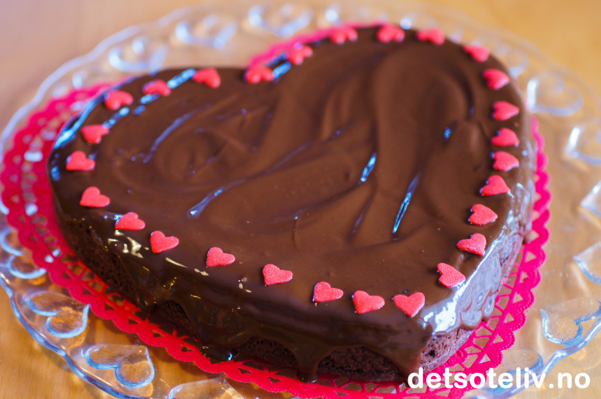 Glaser kaken med sjokoladeglasuren og pynt etter ønske, for eksempel med små, søte sukkerhjerter (se tips).