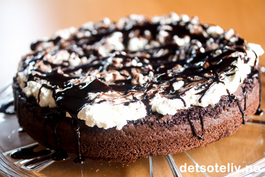 Her har du oppskriften på en myk og deilig sjokoladekake med saftig og litt klebrig konsistens. Kakedeigen skal bare røres raskt sammen for hånd. På toppen er kaken dekket med pisket krem som er marmorert med sjokoladesaus. Kaken smaker nydelig og passer kjempegodt både til selskap og til hjemmekos.