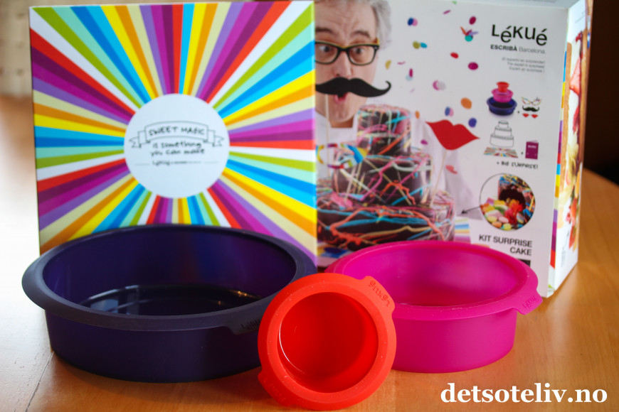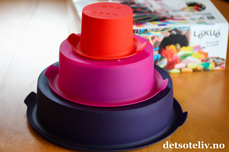 Jeg har brukt et Bakeformsett til Etasjekake i silikon fra Lékué som er en av de mange bakeformene som man får kjøpt i nettbutikken til Bakeren og Kokken. Formene i settet måler 8 cm (liten) 15 cm (mellom) og 22 cm (stor) og rommer til sammen ca. 2 liter kakedeig.