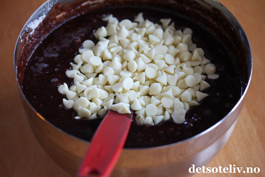 Hakk hvit sjokolade i biter (eller bruk amerikanske hvite chocolate chips hvis du får tak i dette) og vend de hvite sjokoladebitene inn i sjokoladedeigen.