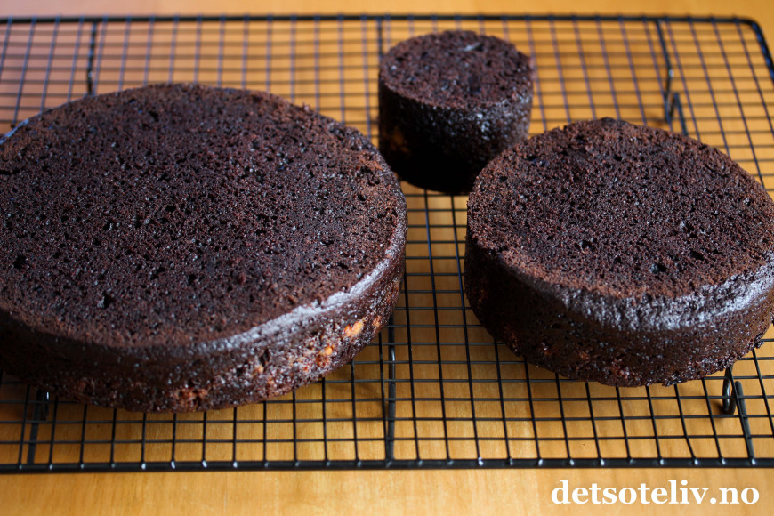 Stek kakene midt i ovnen ved 200°C i 30-35 minutter. Ta den minste kaken ut av ovnen og stek de andre to kakene i 10 minutter til (sjekk med kakepinne at de er helt gjennomstekte i midten).