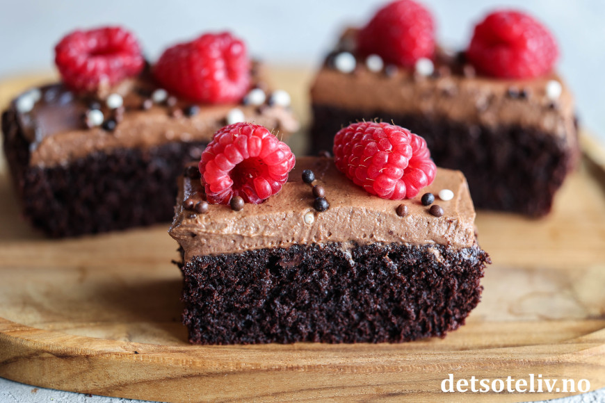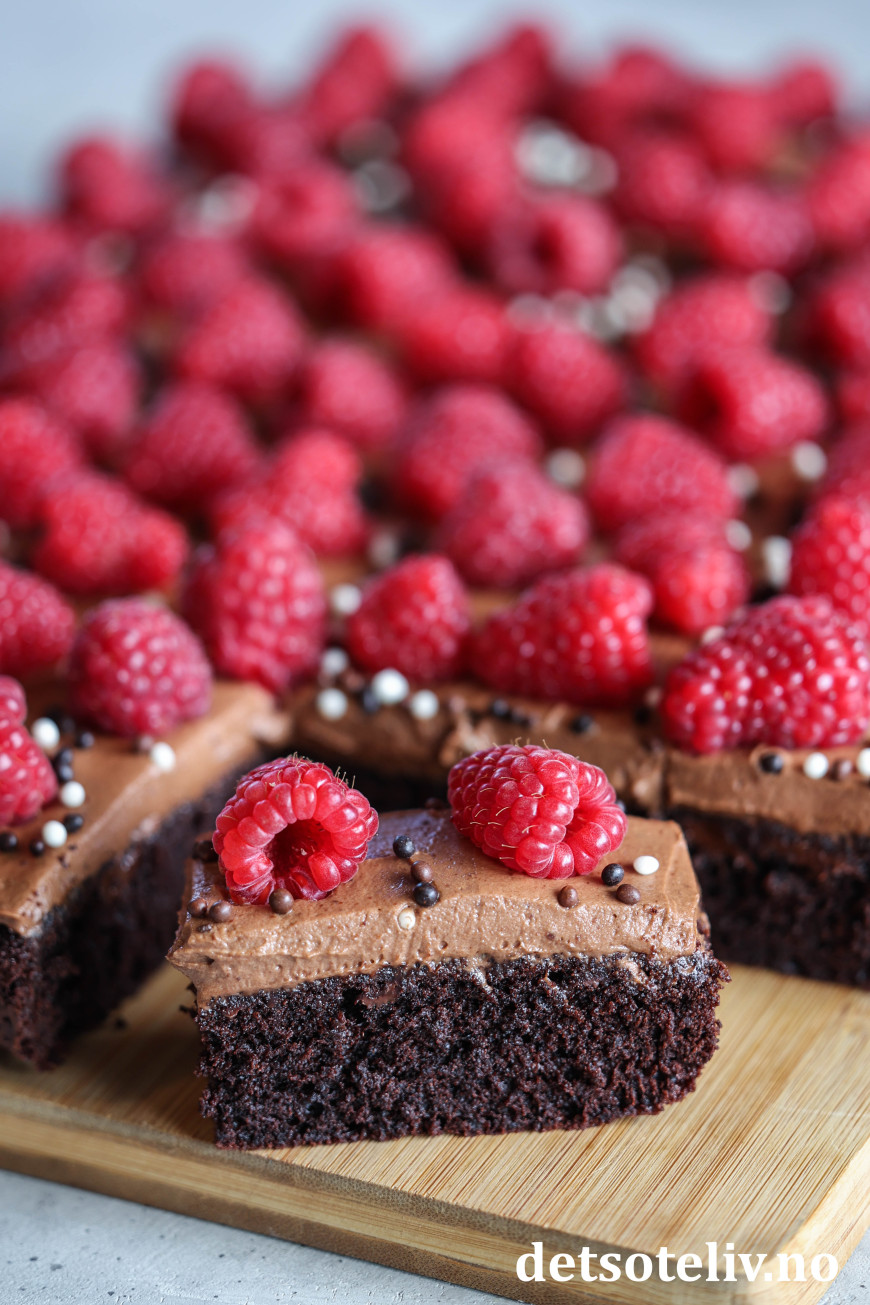 Her har jeg laget en stor sjokoladekake i langpanne, som dekkes med en knallgod og luksuriøs sjokoladekrem som lages med mascarpone og smeltet kokesjokolade. Store, søte bringebær på toppen kommer virkelig til sin rett!