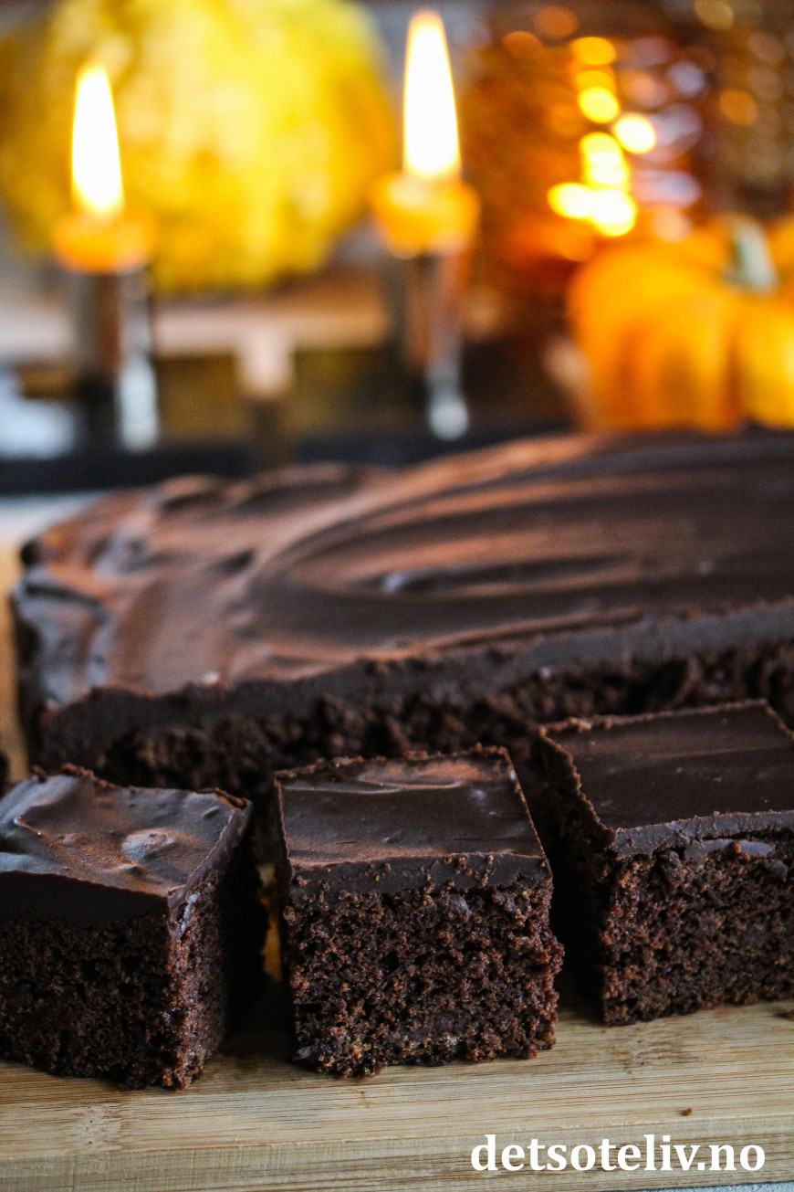 Her har jeg laget en amerikansk Pumpkin Chocolate Cake, som er en deilig sjokoladekake i langpanne med masse sjokolade og sjokoladeglasur, og som blir ekstra saftig av gresskarmos i deigen. 😍
