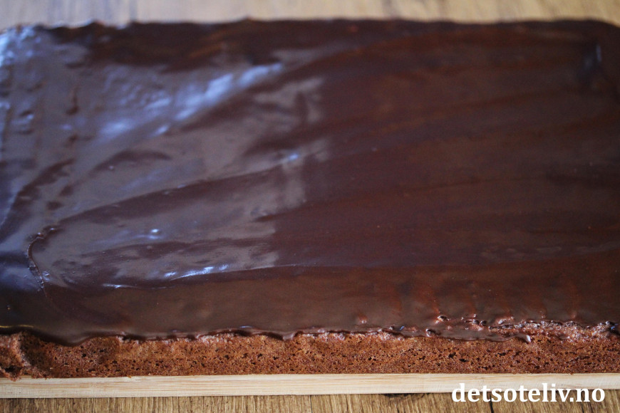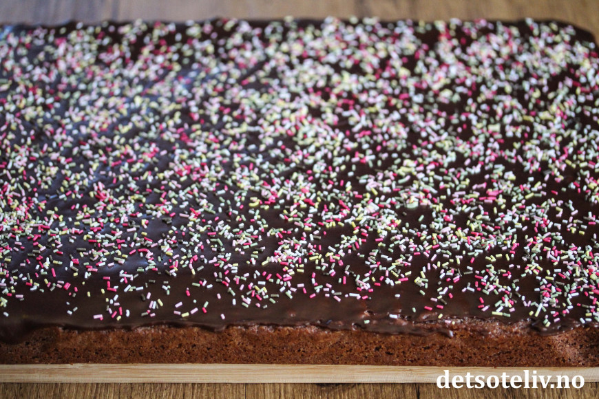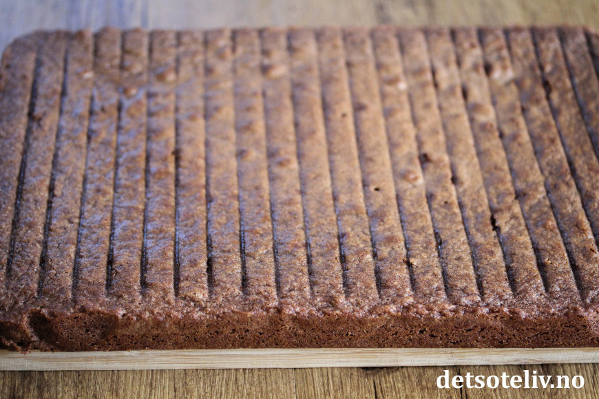 Ha deigen i en stor, bakepapirkledd langpanne (ca 30x40 cm). Stek kaken på nederste rille i ovnen ved 175°C i ca. 30 minutter (sjekk med kakenål at kaken er gjennomstekt i midten før du tar den ut av ovnen). Avkjøl kaken i formen. Hvelv kaken ut av langpanne og fjern bakepapiret.