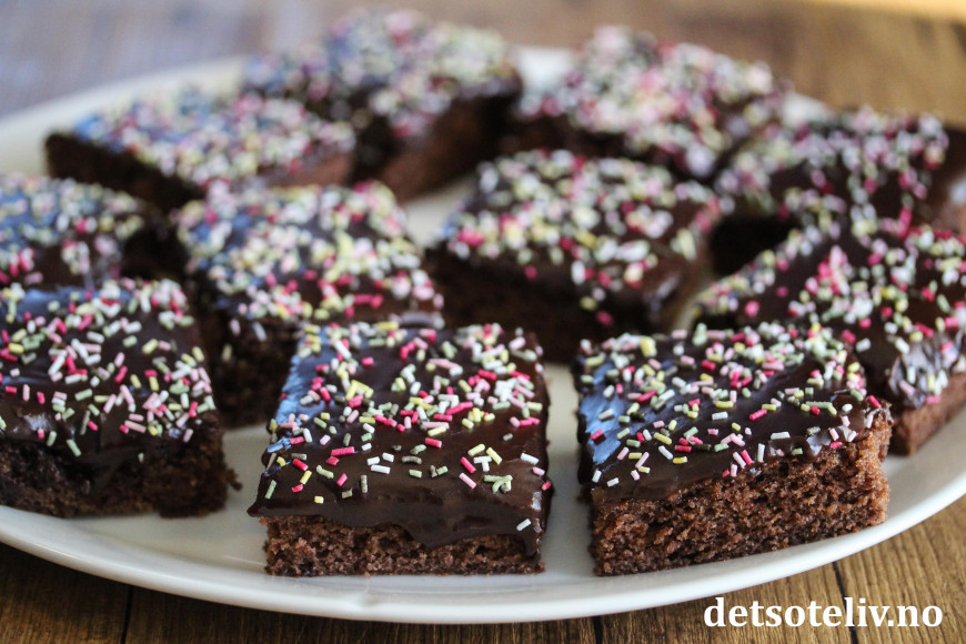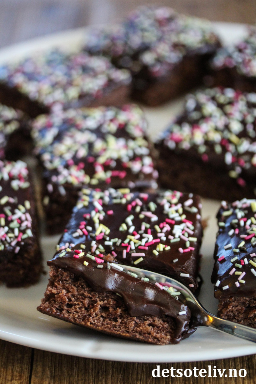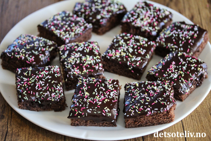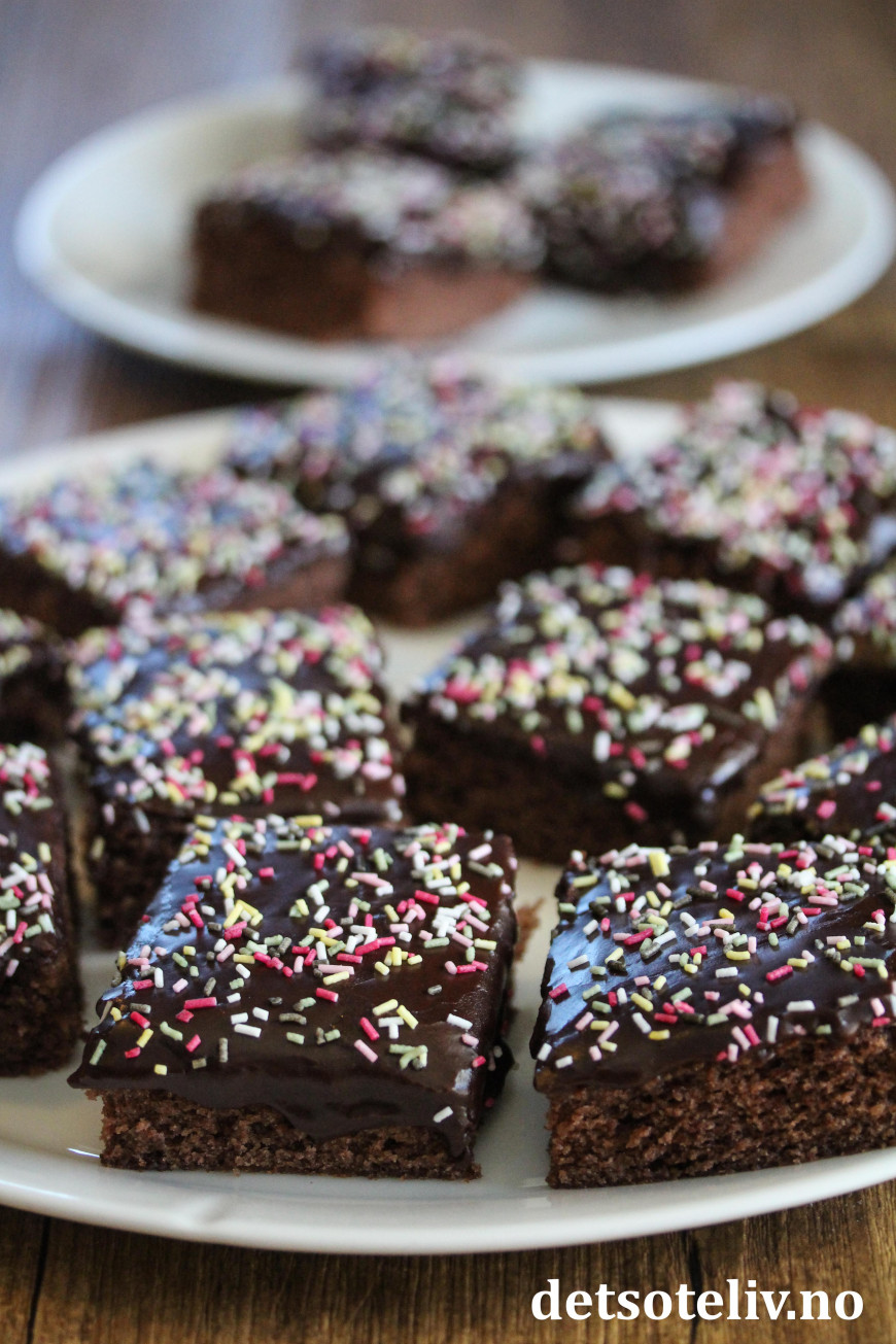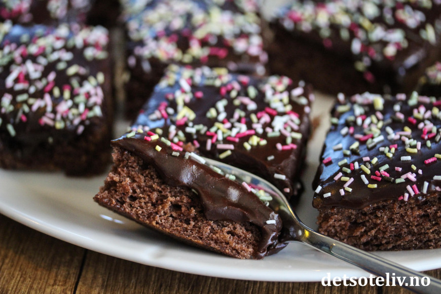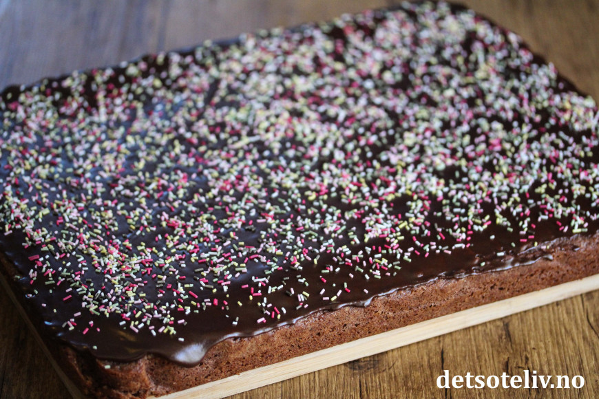 Fantastisk god sjokoladekake - denne lager vi ofte! Jeg pleier å stikke noen hull i kaka før jeg har på glasur, da trekker glasuren seg ned i kaka og den holder seg saftig i flere dager.