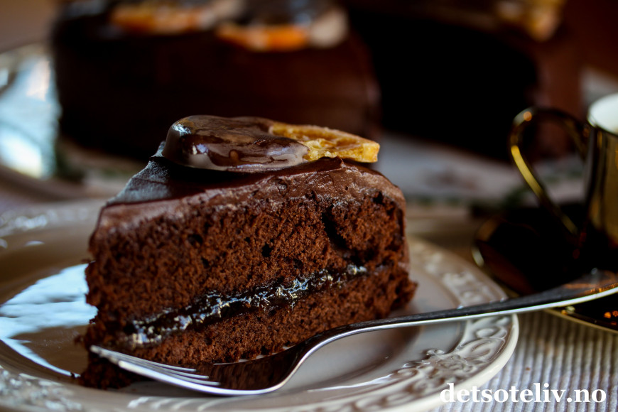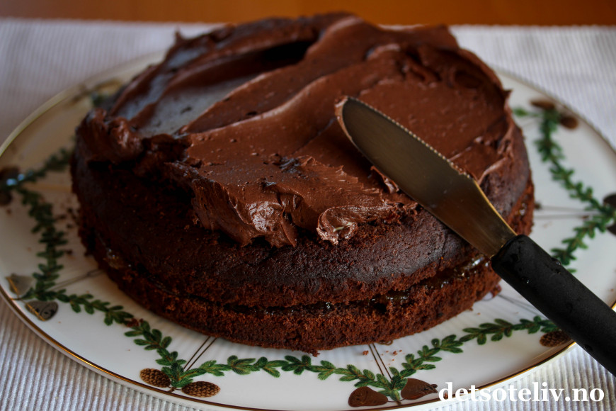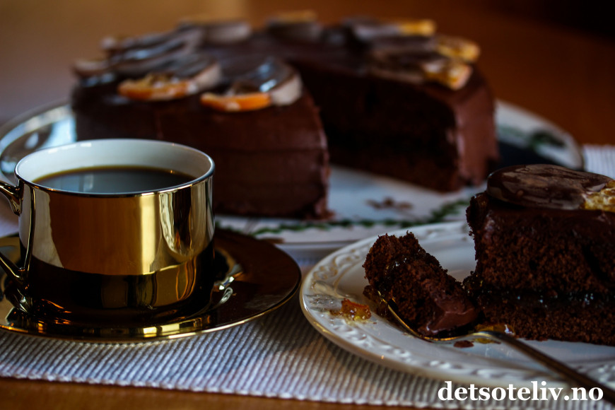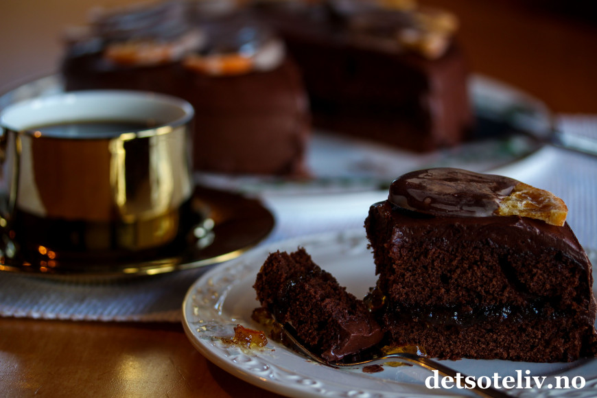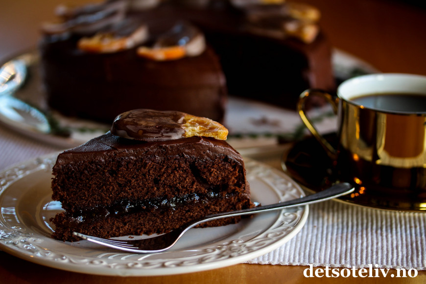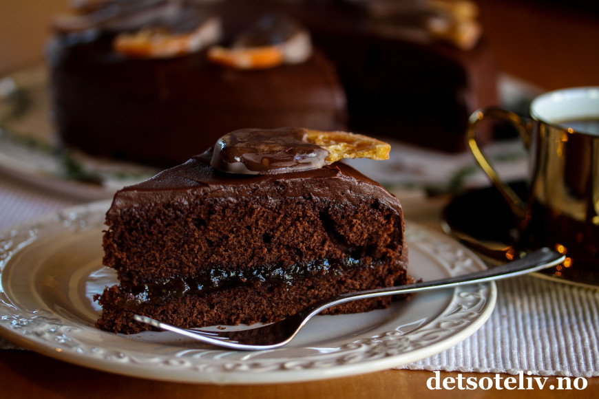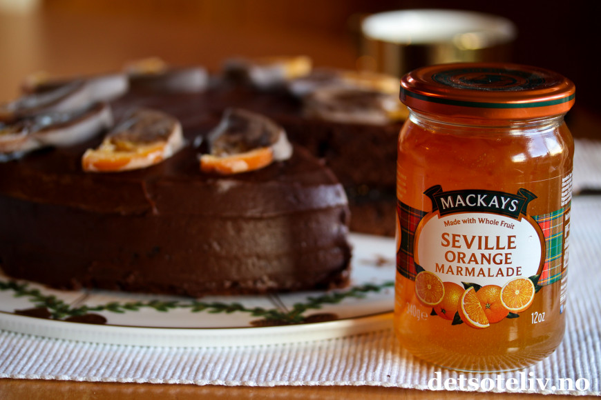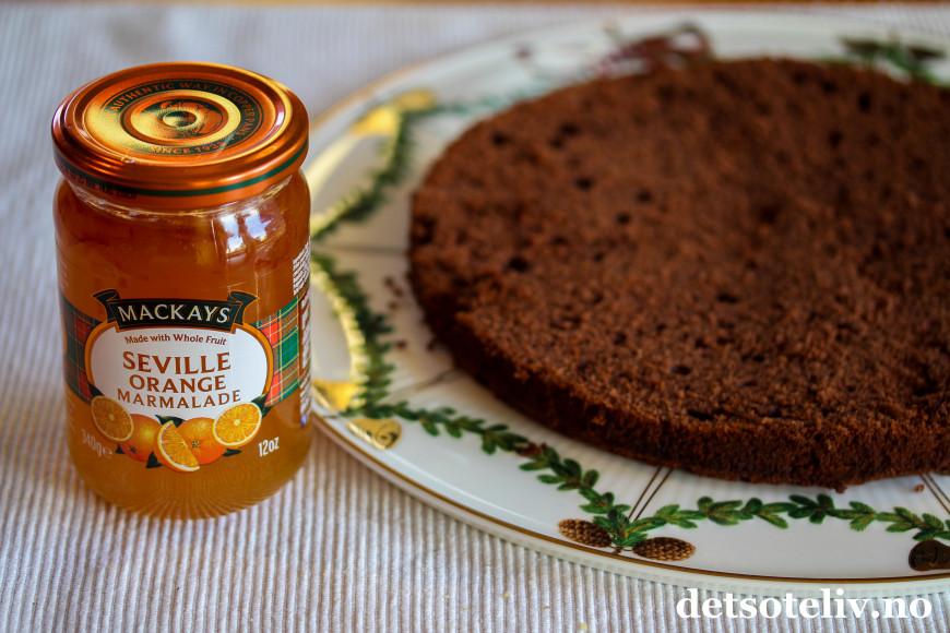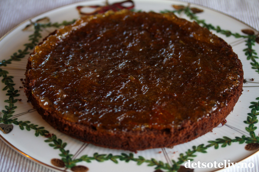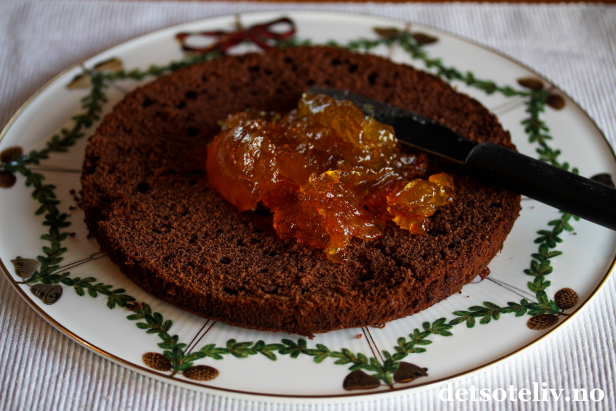 Appelsinsmaken kommer delvis av revet appelsinskall i sjokoladekaken, men det viktigste er fyllet som består av fantastisk god appelsinmarmelade.