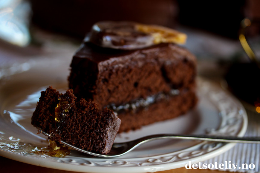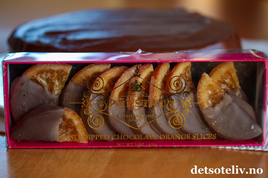♥ De kandiserte, sjokoladedyppede appelsinene som jeg har brukt på kaken har jeg kjøpt i London.