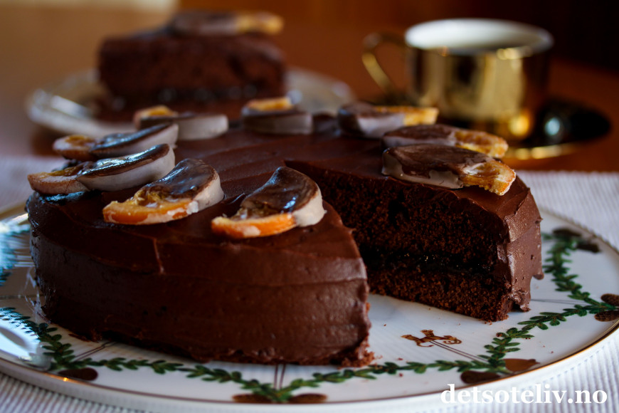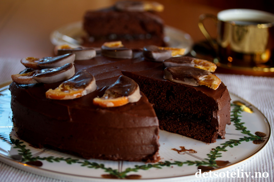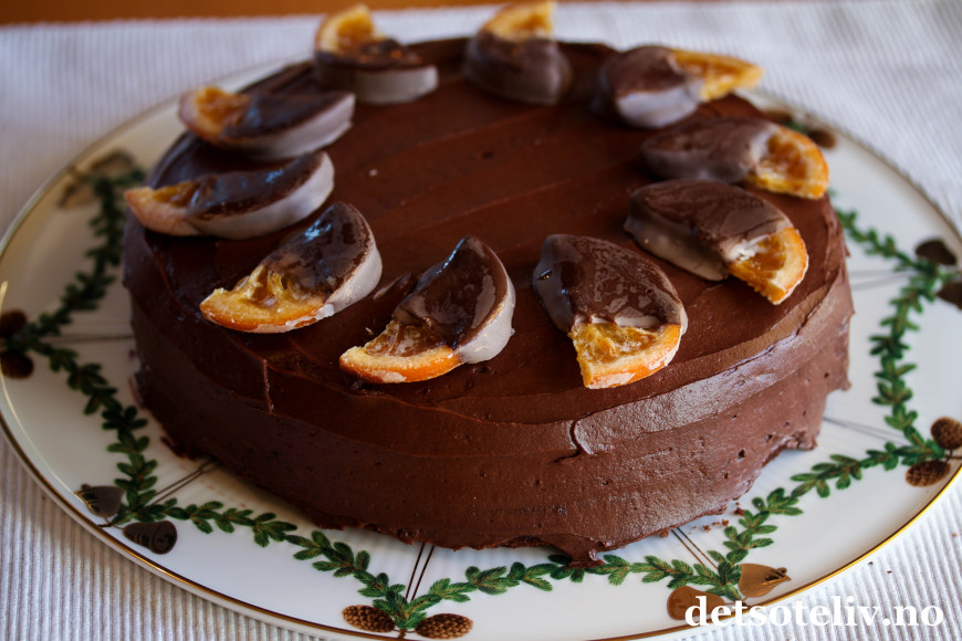 ♥ De kandiserte appelsinene som jeg har brukt på kaken har jeg kjøpt i London. Får du ikke tak i noe lignende, kan du gjerne pynte kaken med sjokoladekonfekt i stedet. Mandarinbåter (godt avrente hvis de er hermetiske) passer også veldig godt som pynt.