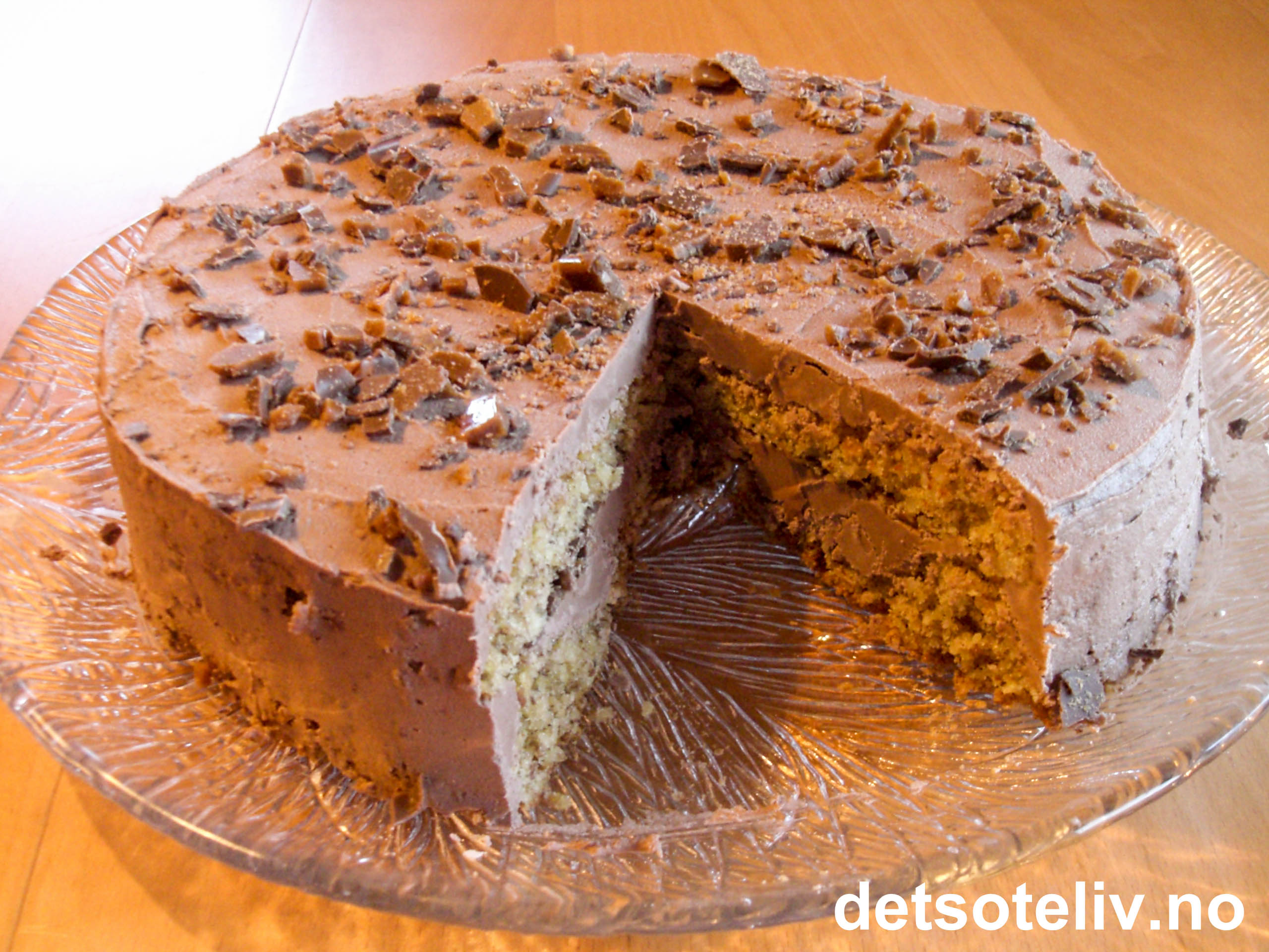Fordel halvparten av sjokoladekremen mellom kakebunnene. Smør resten rundt hele kaken. Pynt med hakket Daim til slutt.