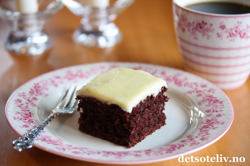 Hell deigen i en bakepapirkledd stor langpanne (30x40 cm). Stek kaken midt i ovnen ved 170°C i 45 min. Avkjøl helt. Hvelv ut av formen og fjern bakepapiret.