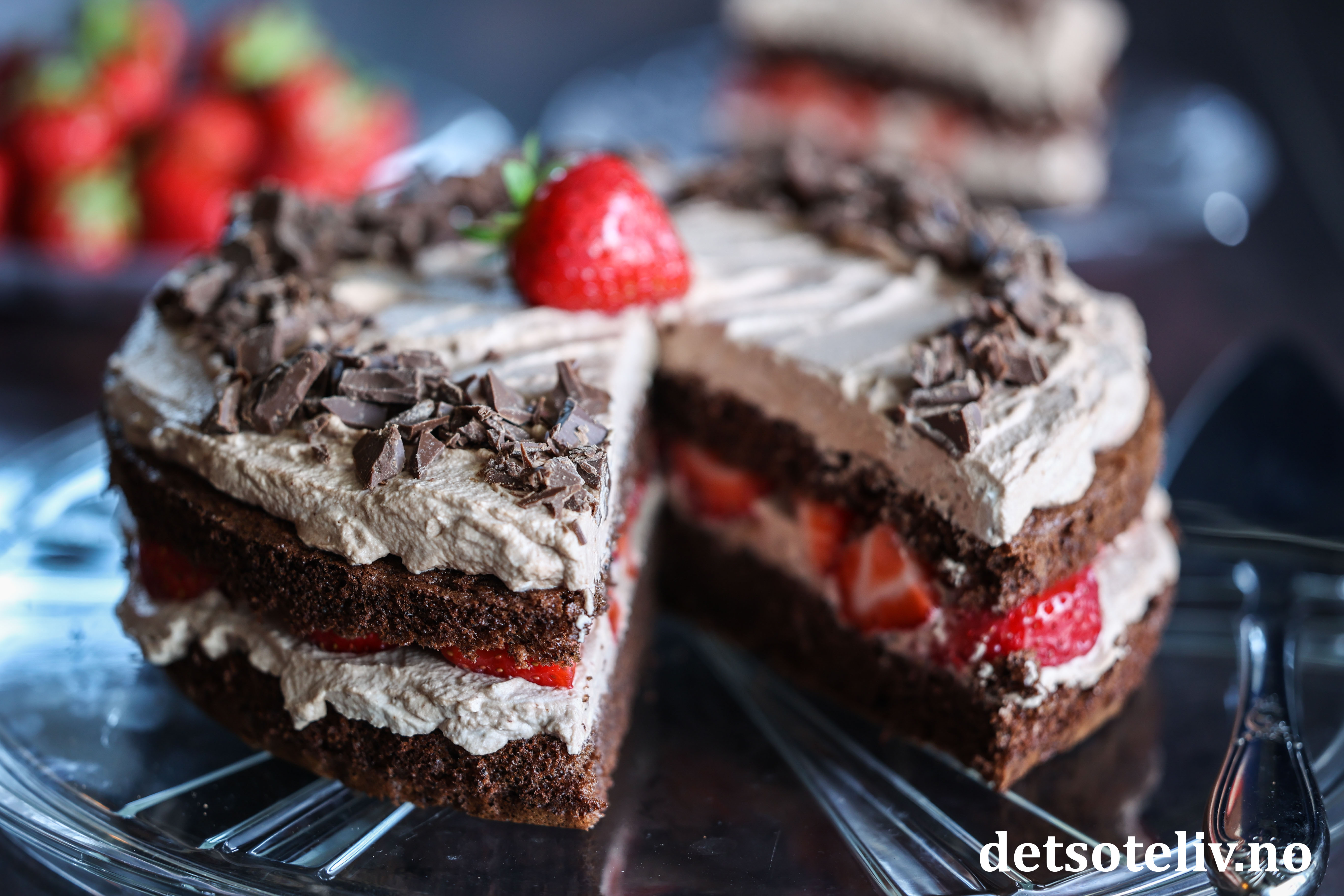 Sjokoladekake med jordbær er en enkel med FANTASTISK DEILIG sommerkake, som består av en usedvanlig myk sjokoladekakebunn, lys sjokoladekrem, friske jordbær og hakket sjokolade!