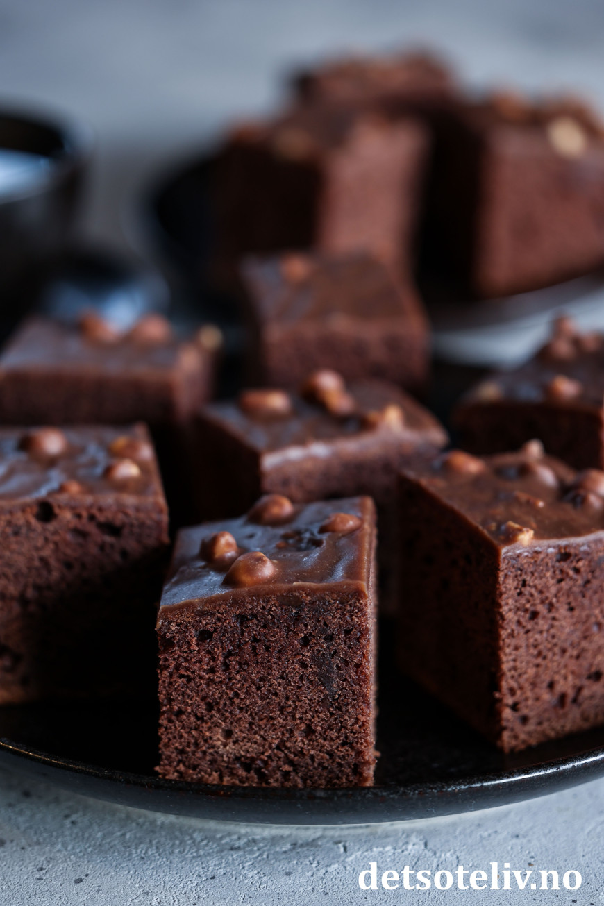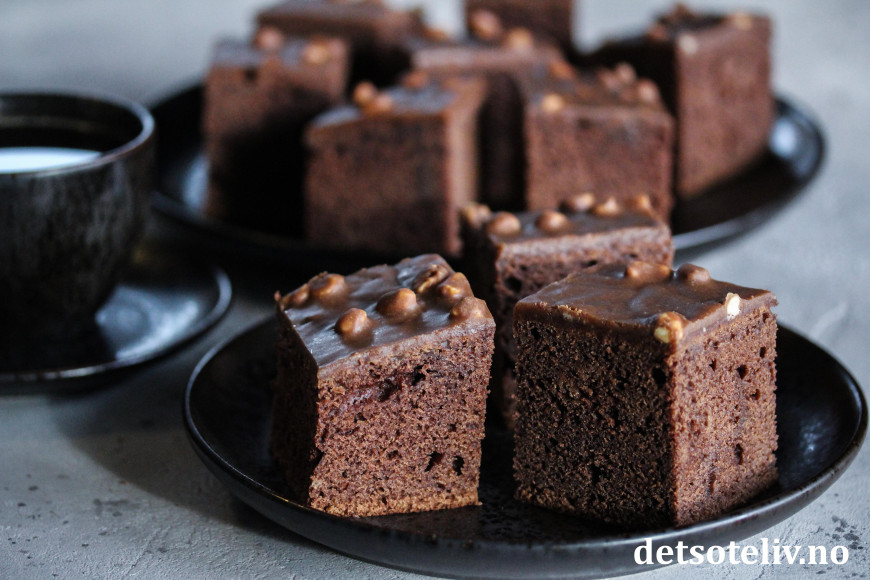 ♥ Denne oppskriften gir temmelig høy kake i liten langpanne. Tilpass steketiden til din ovn. Sjekk med kakenål at kaken er gjennomstekt før du tar den ut av ovnen. Hvis kaken ikke er gjennomstekt, men begynner å bli mørk på toppen, kan du dekke over kaken med et stykke bakepapir eller aluminiumsfolie den siste delen av steketiden.
