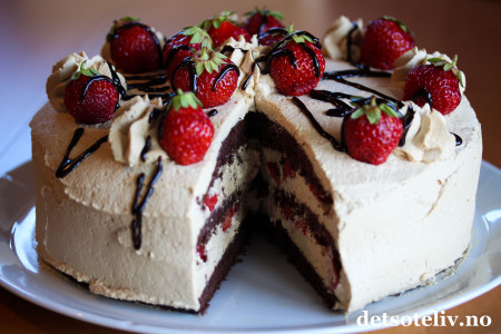 Dette er en kjempeflott festkake med nydelig smakskombinasjon: sjokolade, kaffe og jordbær!