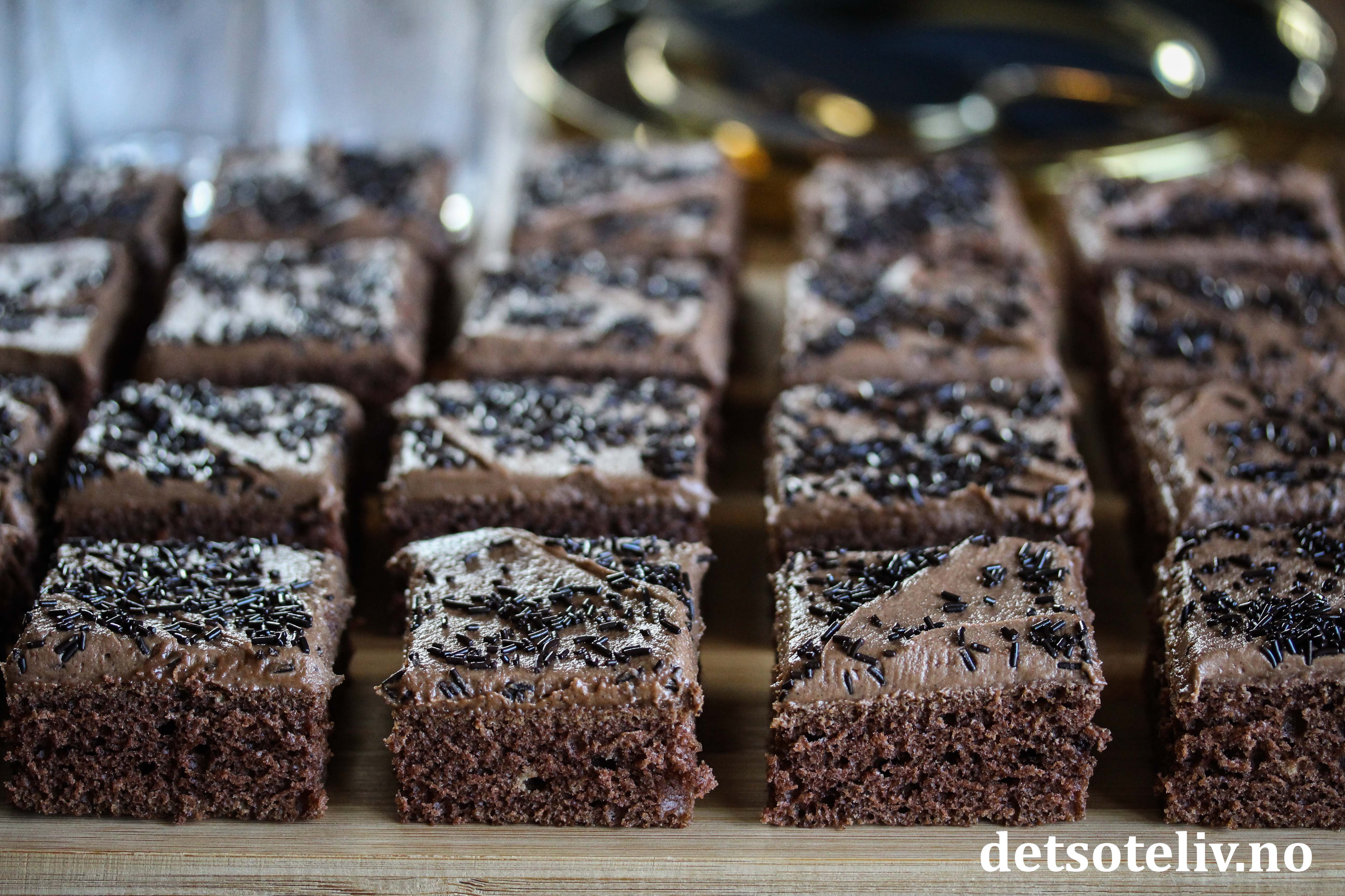 Bre glasuren over kaken med en smørekniv. Strø over sjokoladestrøssel og del kaken opp i passe store firkanter.