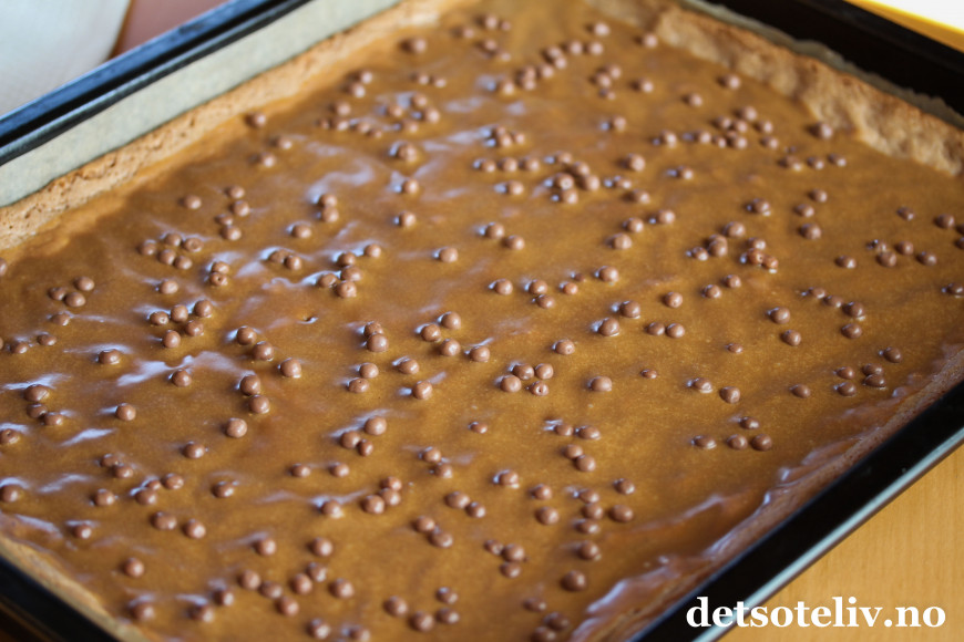 Fordel deigen utover i en stor, bakepapirkledd langpanne (ca 30x40 cm). Stek kaken midt i ovnen ved 175°C i 30-40 minutter, til kaken er gjennomstekt. Avkjøl kaken i langpannen.