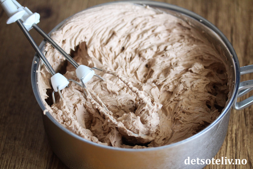 Dagen etter tas kjelen med melkesjokoladefløten ut av kjøleskapet. Rør den jevn med en slikkepott og pisk den deretter opp med en elektrisk håndmikser til du får en tykk, glatt sjokoladekrem.