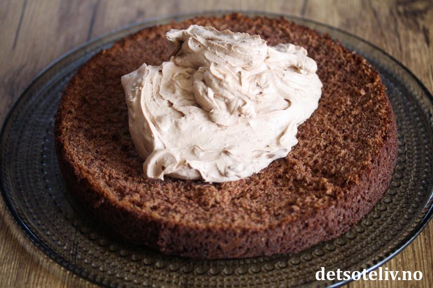 Løsne kaken fra formen og dra av bakepapiret. Del kaken i to bunner og legg den nederste kakebunnen på et fat.