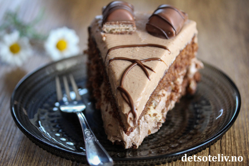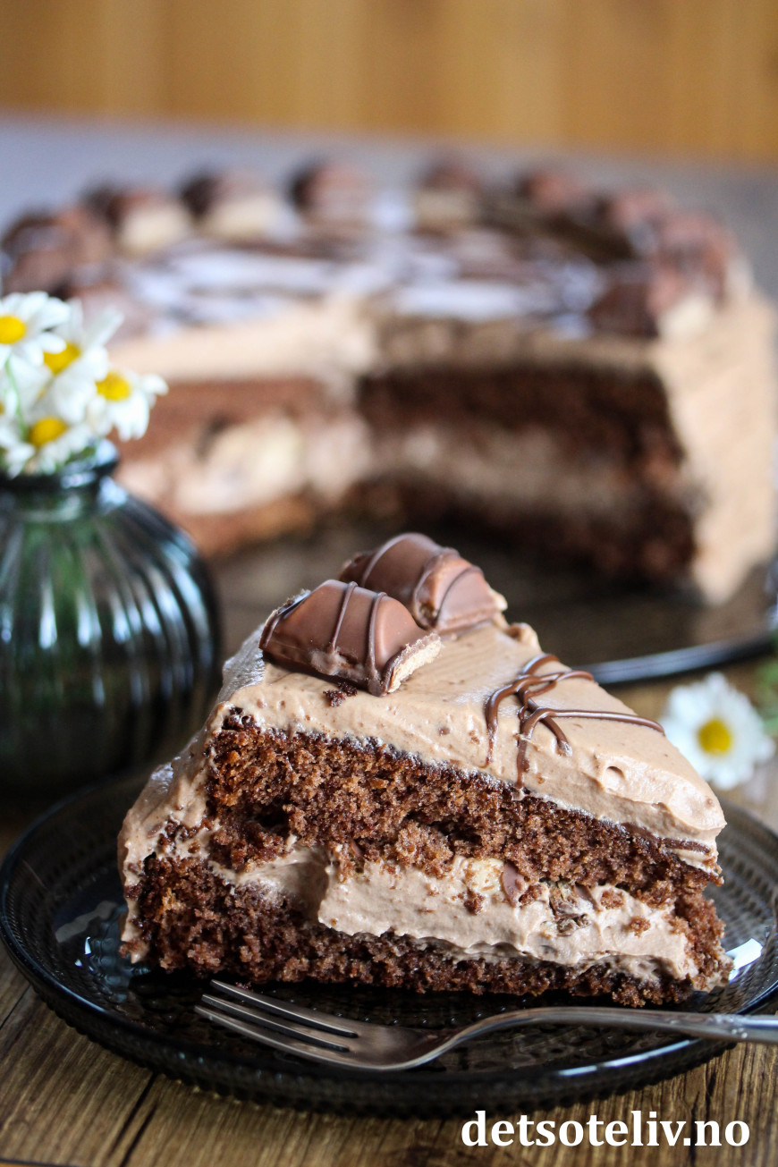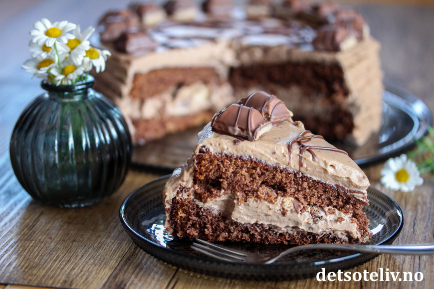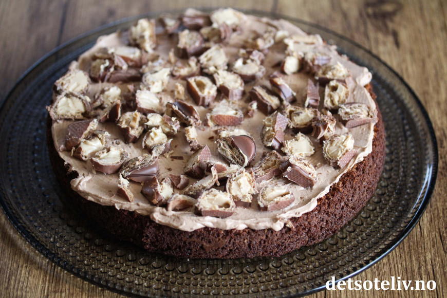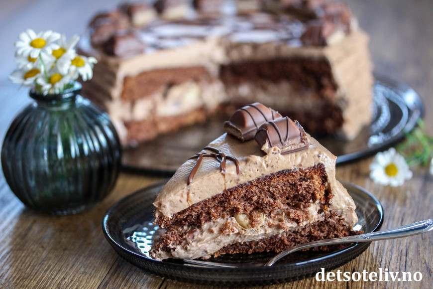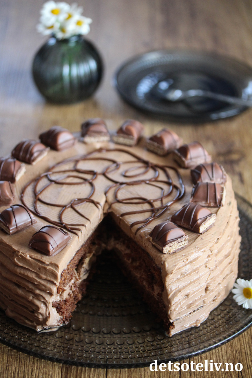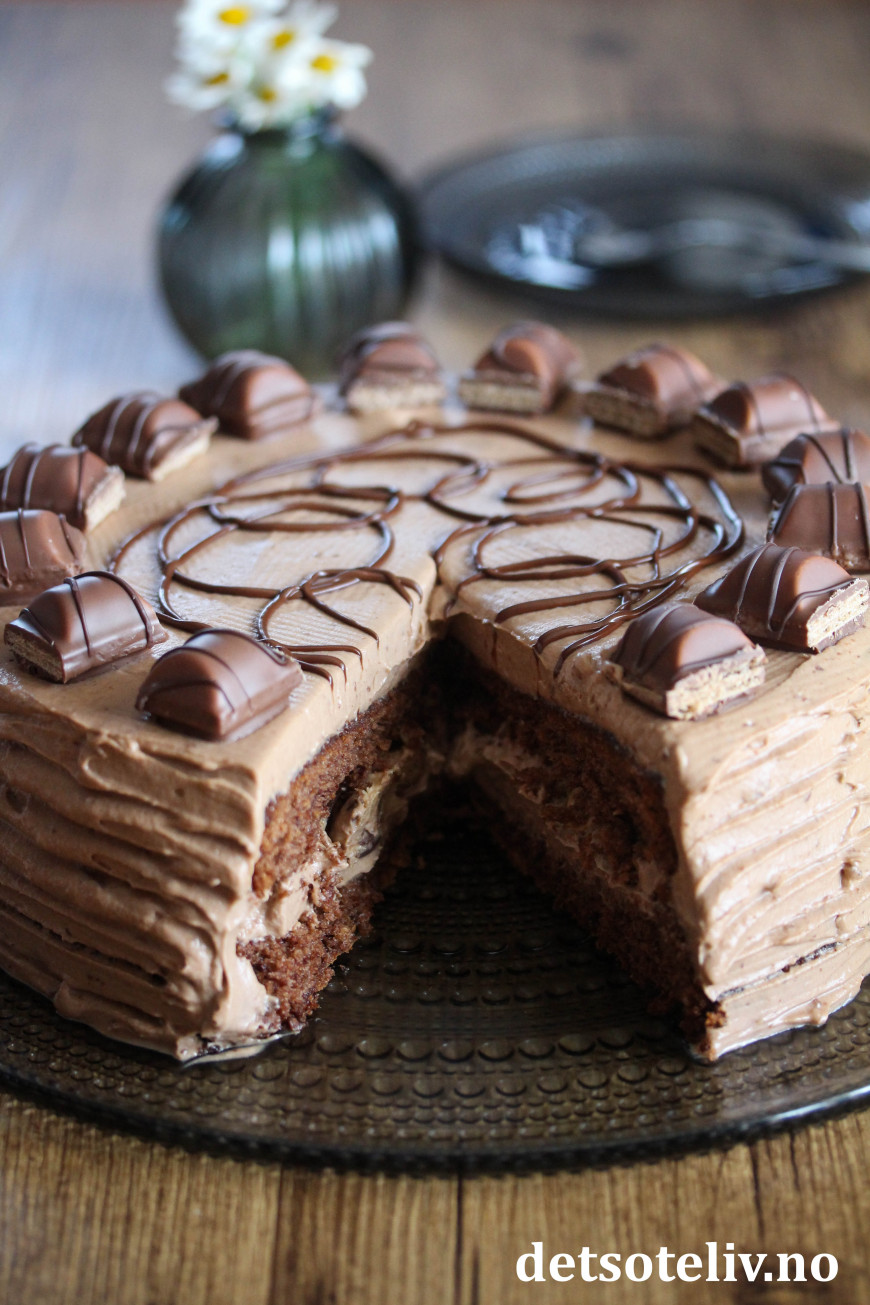 Her har jeg laget en luftig sjokoladekakebunn som jeg har fylt med lys og lett, fløtebasert melkesjokoladekrem. Jeg har i tillegg brukt hakkede Kinder Bueno i fyllet og biter av Kinder Bueno som pynt.