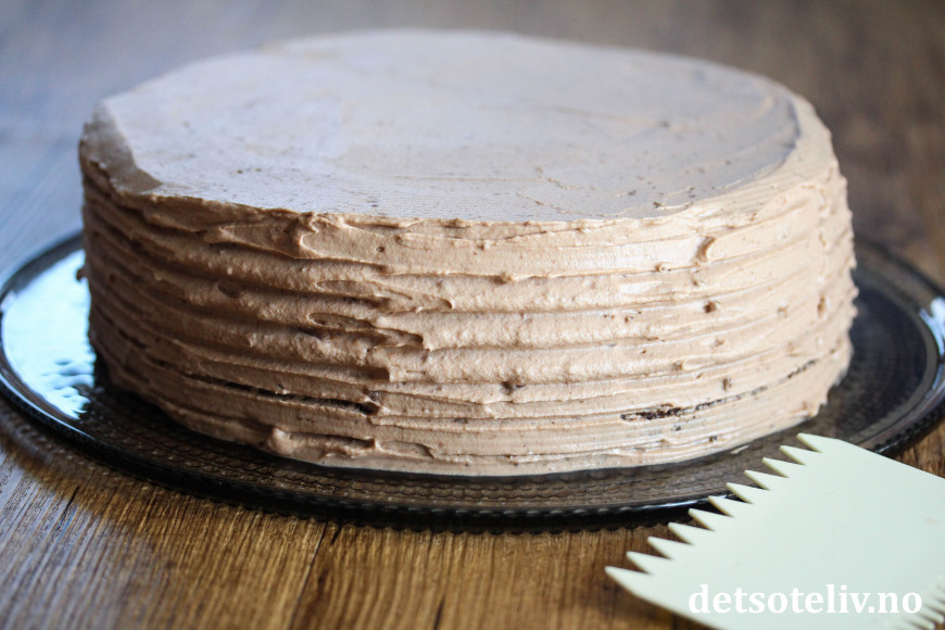 Legg på den andre kakebunnen og dekk hele kaken med resten av melkesjokoladekremen.