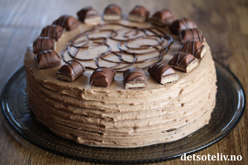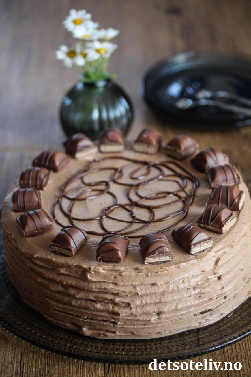 Pynt kaken med biter av Kinder Bueno og ringle over smeltet sjokolade til slutt.