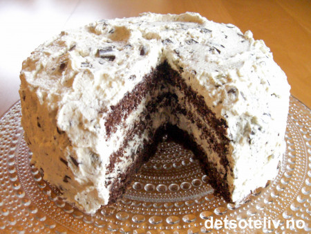Del kaken i tre bunner. Dynk dem eventuelt med konjakk, melk eller sjokolademelk (se tips). Fordel konjakkremen mellom kakelagene og rundt hele kaken.