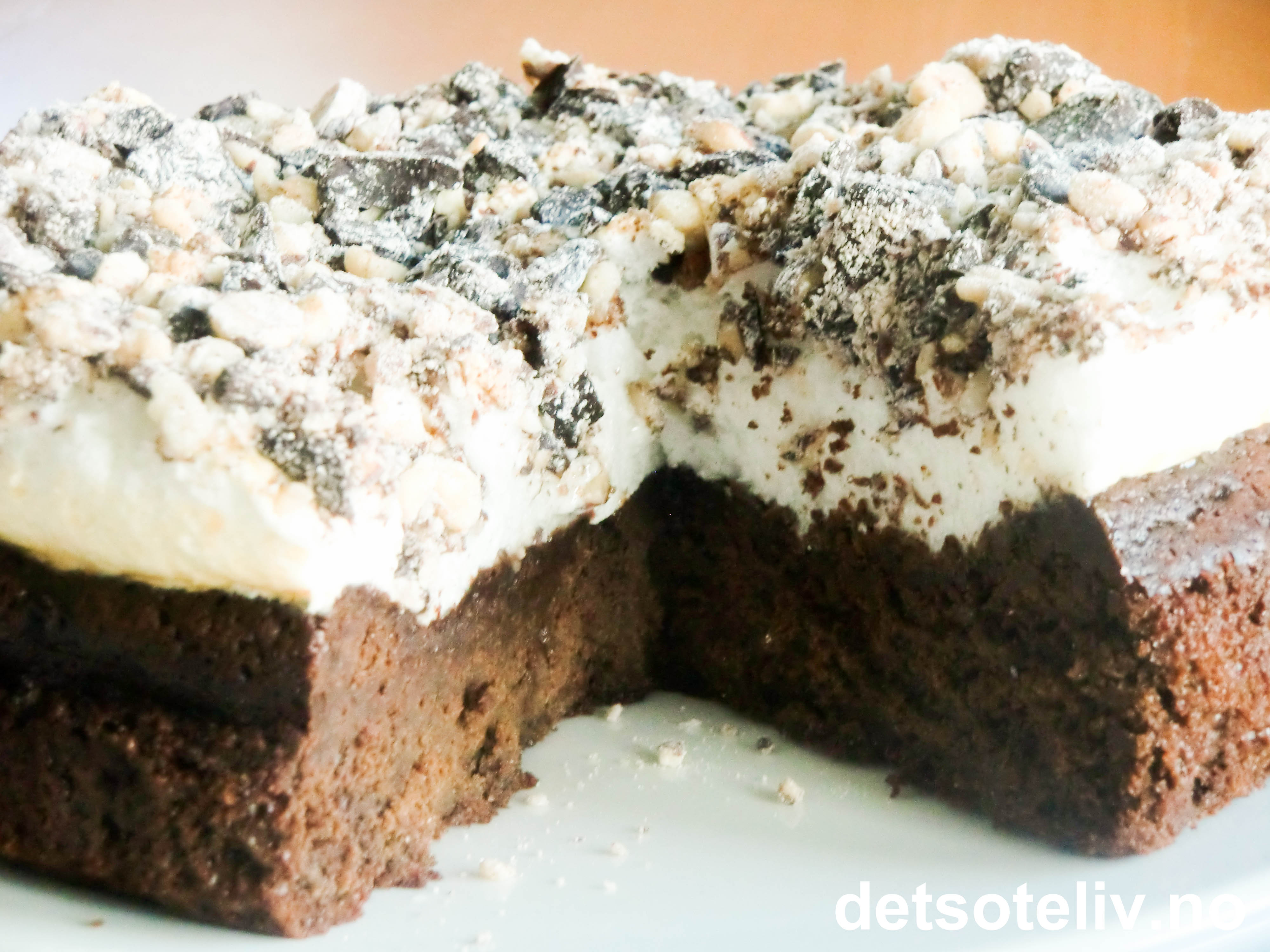 Her har du en tung, fuktig, mørk sjokoladekake med hint av rom og vanilje, som dekkes med et tykt, skummende og kritthvitt lag deilig marengs.