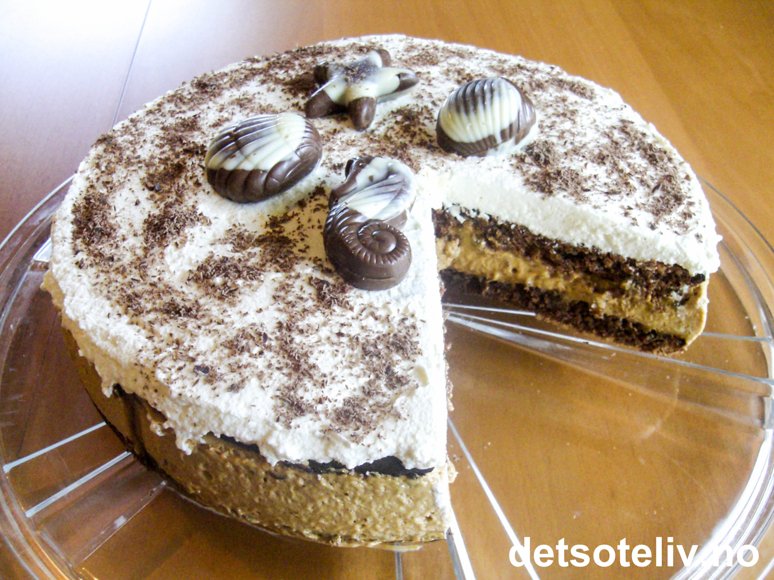 Kaken på bildet er pyntet med belgisk sjokoladekonfekt med nougatfyll.