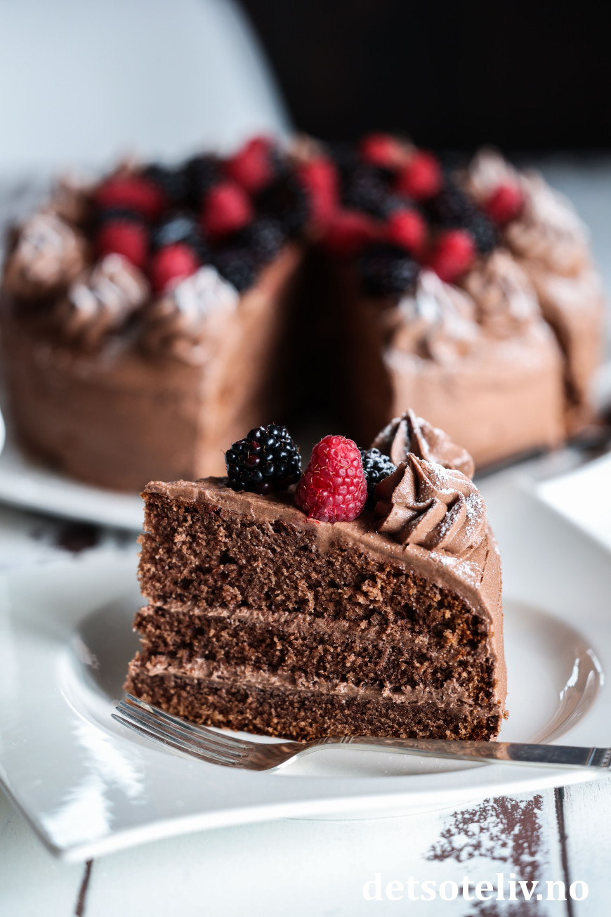 Det er jo litt å velge mellom her på Det søte liv, så for å gjøre valget litt lettere for deg, skal du få en anbefaling: Lag en klassisk Sjokoladekake med sjokoladekrem! 😃 Noen friske bær på toppen gjør kaken ekstra fristende, og frisker opp smaken.