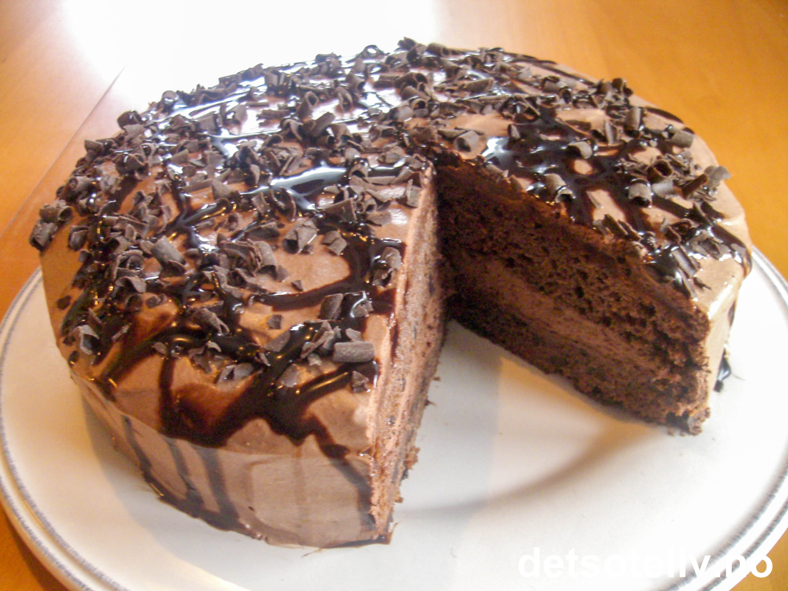 Del kaken i to bunner. Fordel omtrent halvparten av sjokolademoussen over bunnen. Legg på den andre kakebunnen og fordel resten av sjokolademoussen jevnt over hele kaken. Dryss over høvlet sjokolade. Sett kaken i kjøleskapet i en time, til sjokolademoussen har stivnet. Før servering kan du pynte kaken ved å ringle over sjokoladesaus.