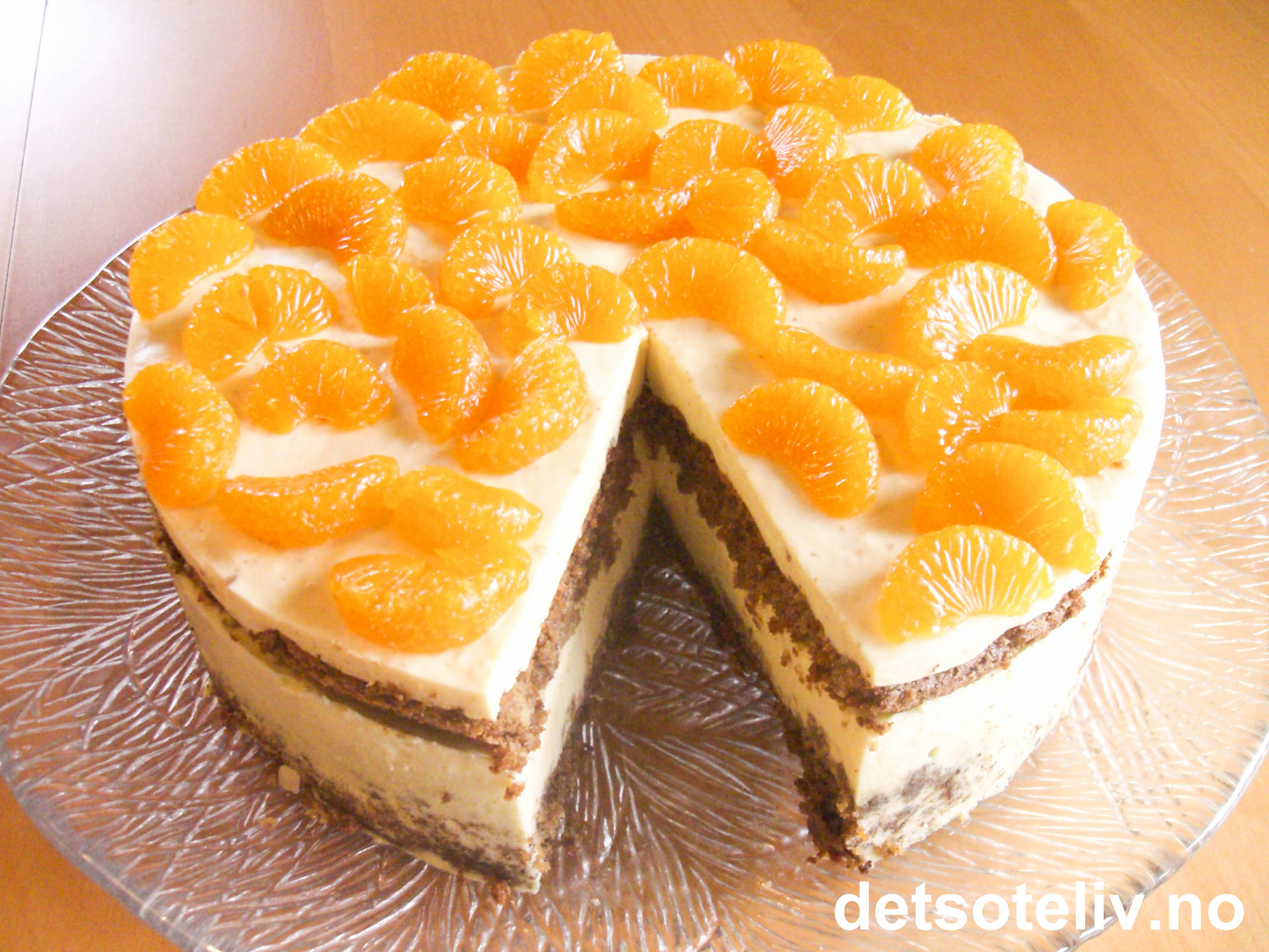 Løsne kakeringen fra kaken. Løft deretter kaken forsiktig over på et kakefat ved hjelp av en bred stekespade eller liknende. Pynt kaken med godt avrente mandarinbåter.